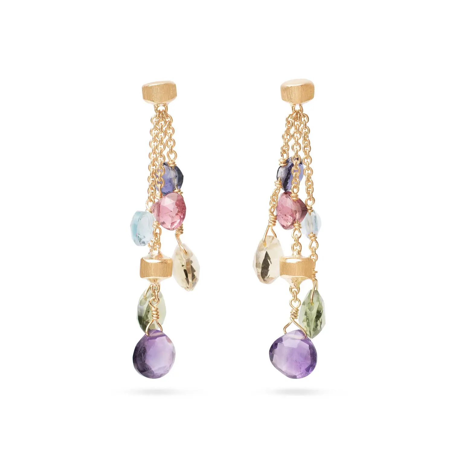 The luxurious Marco Bicego Paradise OB915 MIX01 Y 02 gold earrings are crafted from 18k yellow gold (750/1000) and belong to the iconic Paradise collection, inspired by the vibrant colors of natural gemstones and the light of the Mediterranean landscape. The design combines delicate gold elements with colorful gemstones, creating an elegant yet playful composition.