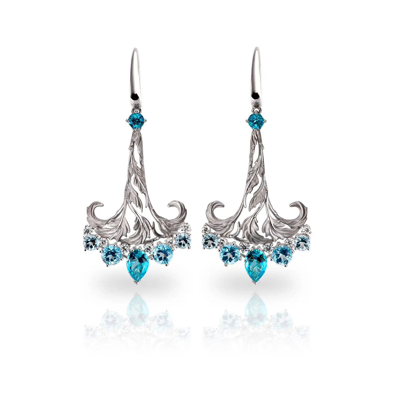 The centerpiece comprises 12 blue topazes, totaling 4.30 ct, each in a pear cut of 6.90 × 3.85 mm — their vibrant blue tones offering a cool, elegant accent. Complementing them are 6 white diamonds, with a combined weight of 0.34 ct, each round cut (Round) and 1.60 mm in size, graded H color and VS clarity, adding refined sparkle to the design.