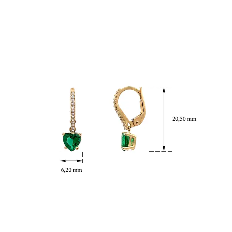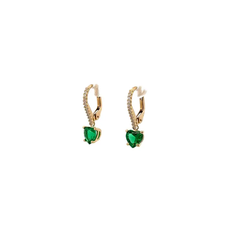 Gold Earrings with Zircones and Emerald Green Hearts
