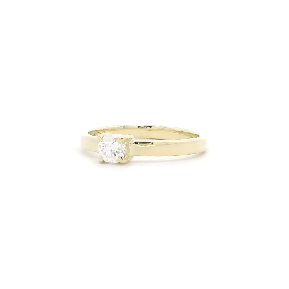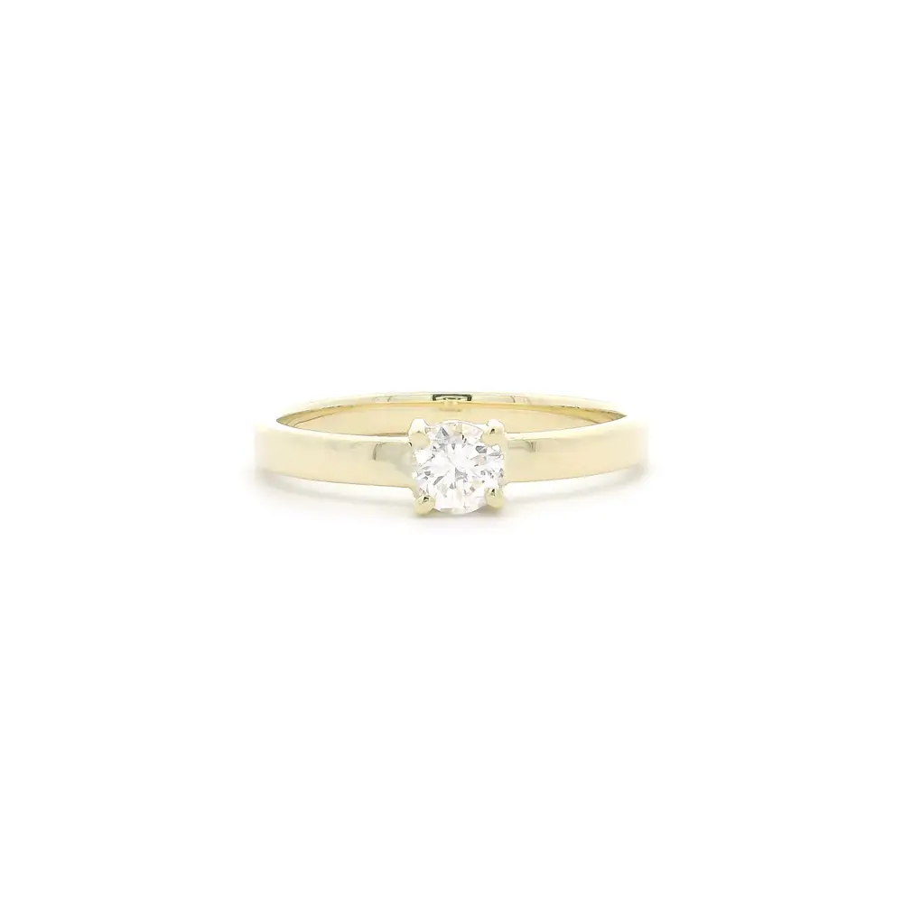 This engagement ring in 18kt yellow gold embodies timeless elegance and the symbol of love. At its heart sparkles a solitaire diamond weighing 0.24 ct, whose brilliant cut enhances the stone’s natural beauty and fire.