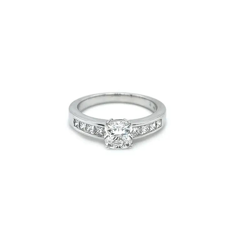The centre stone is complemented by eight natural princess-cut diamonds, each 2.45 mm, totalling 0.41 ct, also in G colour and VS clarity. Their sharp square geometry adds a modern, structured detail to the classic solitaire look, creating a striking and refined composition.