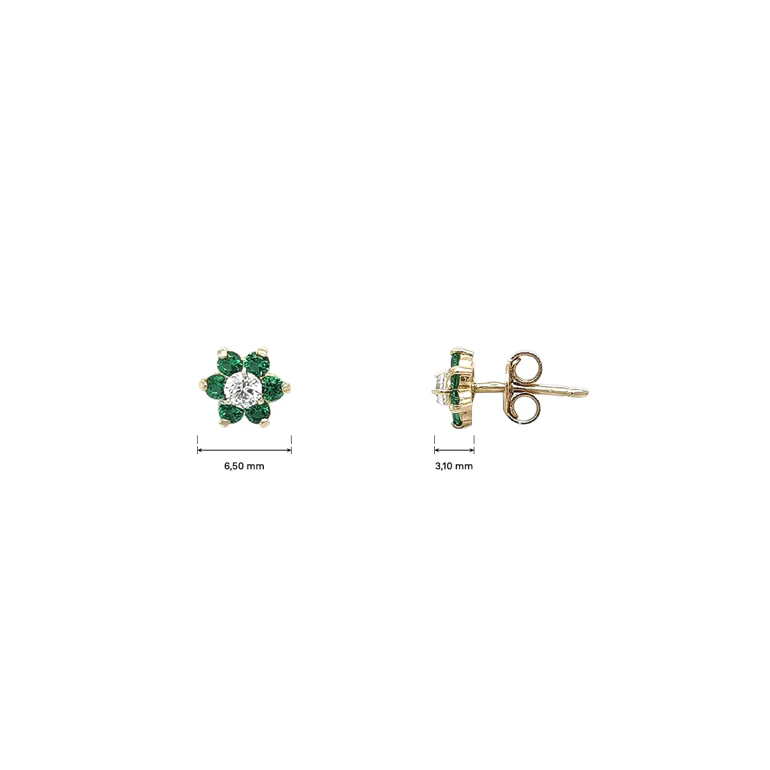 These charming gold flower stud earrings feature a beautiful combination of green and clear stones that create a fresh and elegant look. A clear central stone is surrounded by deep green stones forming the petals, adding a subtle yet captivating contrast.