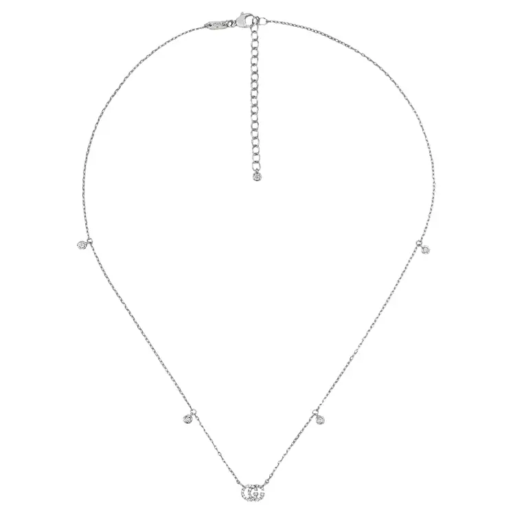 Gucci GG Running YBB47923100100U is a delicate necklace that blends minimalist elegance with the brand’s iconic logo. It shines in 18kt white gold (750/1000) with a polished finish and a slender chain silhouette. For comfort it offers an adjustable length 37–42 cm and width 1.00 mm; the flexible chain-style construction follows the neckline beautifully. The discreet “GG” motif (5.15 × 8.00 mm) looks refined and layers easily with other jewelry.