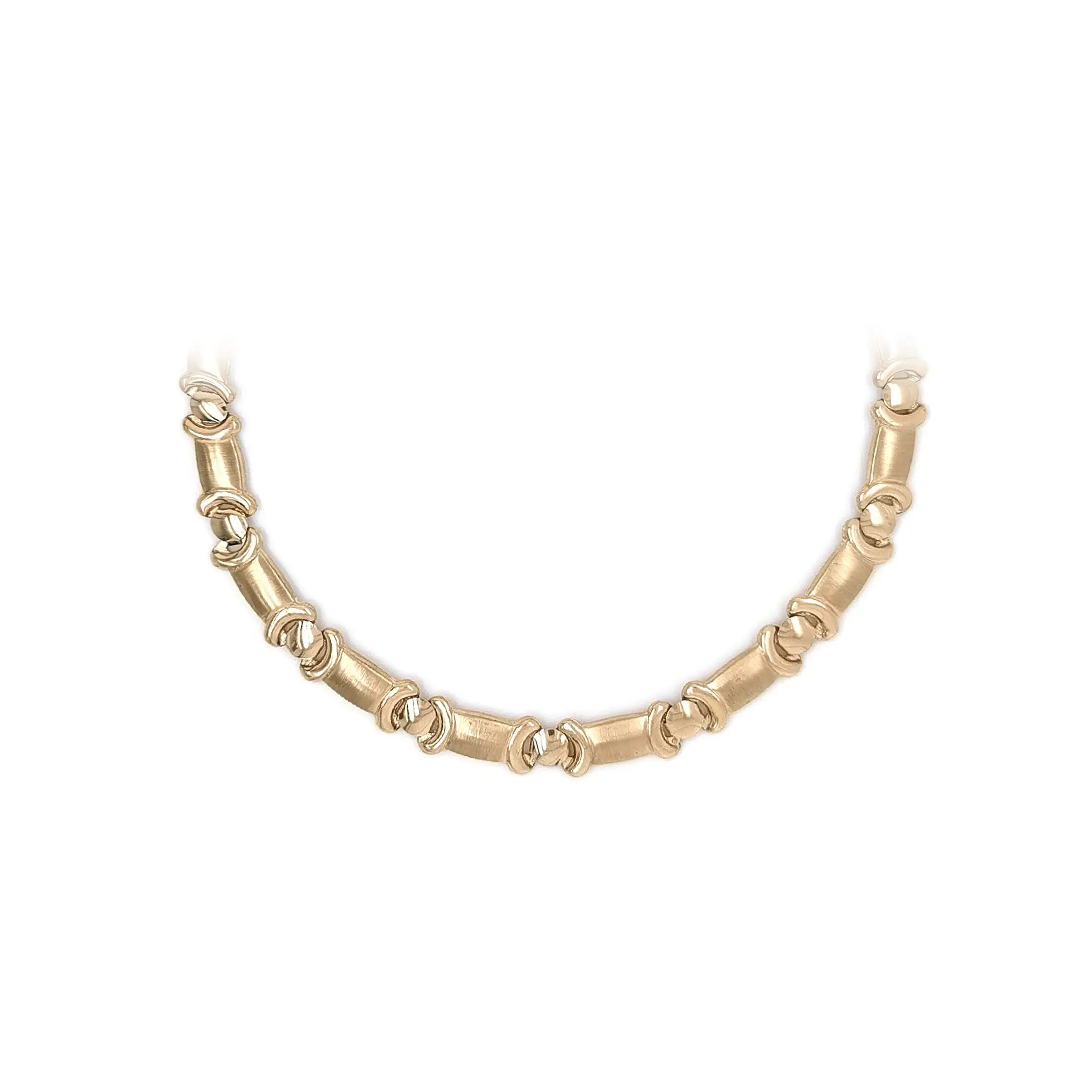 Gold link necklace features a modern interpretation of a classic chain, combining polished and matte finishes. Satin-brushed cylindrical links contrast with smoothly polished connecting elements, giving the necklace depth, texture and a refined visual balance. The design is distinctive yet elegant and timeless.