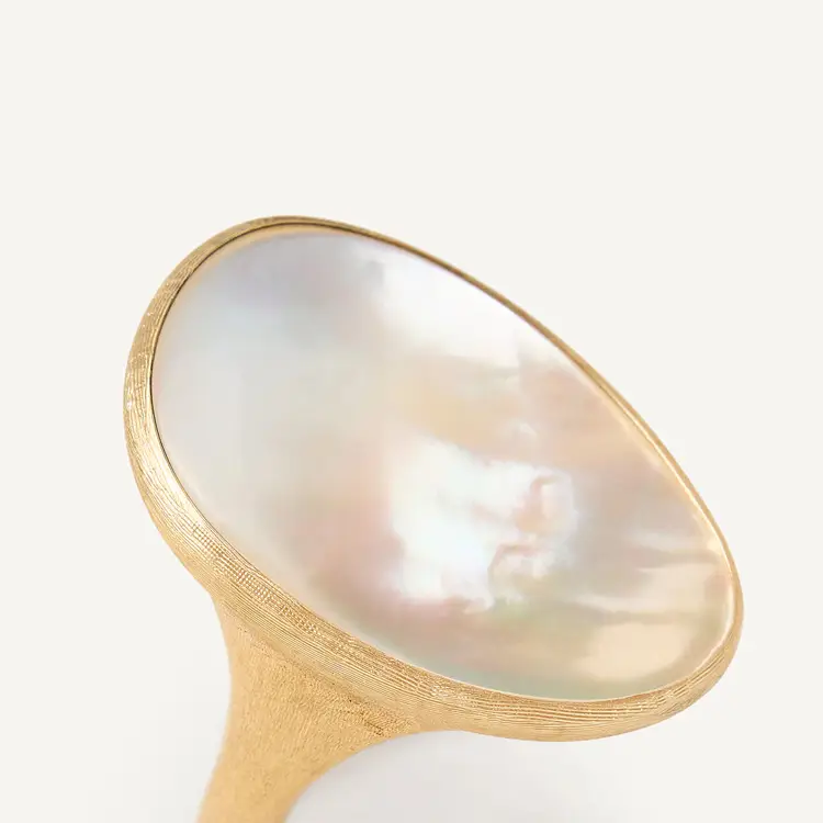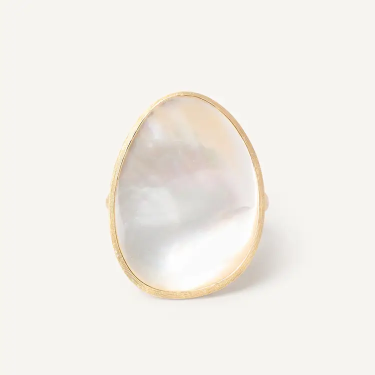 At its center lies a natural mother-of-pearl (pearl / nacre) stone measuring 25.60 × 18.80 mm. This single gemstone introduces subtle color and organic elegance to the ring.