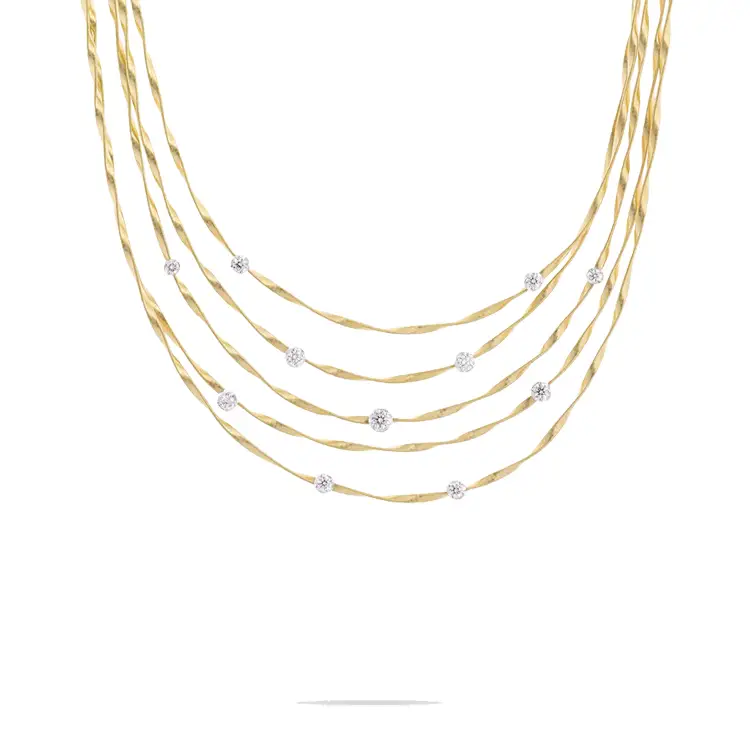 Each piece is crafted from 18kt gold and adorned with the signature hand-twisted coil technique, a hallmark of Marco Bicego. This detail creates subtle movement, texture, and depth, making the jewellery feel alive and unique. Marrakech includes necklaces, bracelets, earrings, and rings, often enhanced with diamonds for added brilliance.