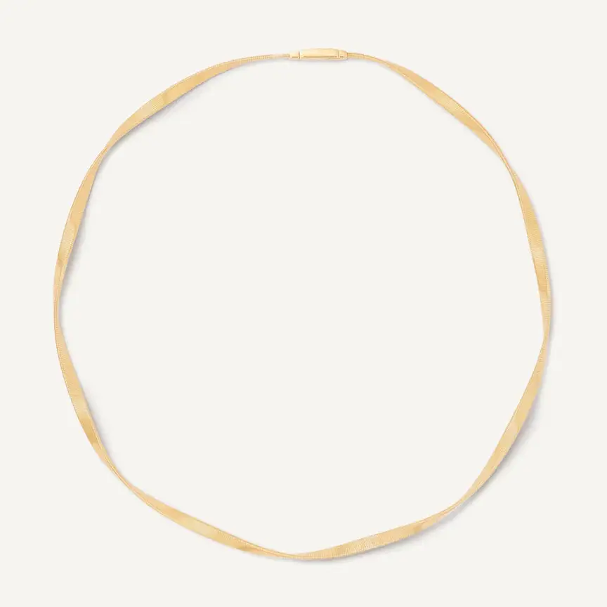 This refined necklace from the Marco Bicego Marrakech collection embodies the signature fusion of artisanal craftsmanship and modern elegance. Crafted from 18kt yellow gold (750/1000) and finished with a distinctive mix of polished and matte textures, it showcases the brand’s iconic hand-twisted gold threads. With a length of 42.5 cm, it sits beautifully along the neckline.
