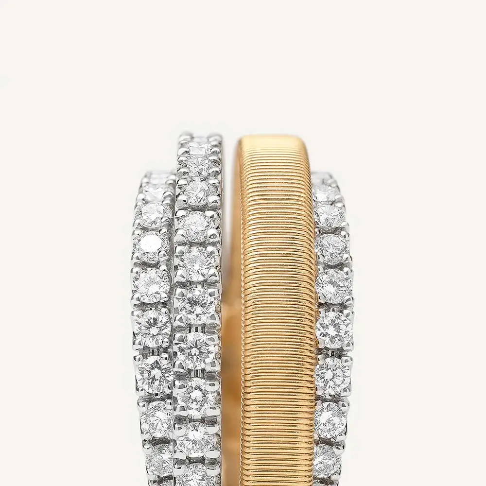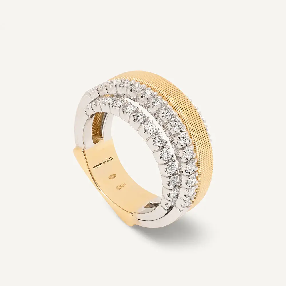 The Marco Bicego Masai AG363 B2 YW M5 ring blends bold design with refined luxury. Crafted from 18kt combined gold (750/1000) and finished with a polished surface, it accentuates sculptural lines and elegant contrast.