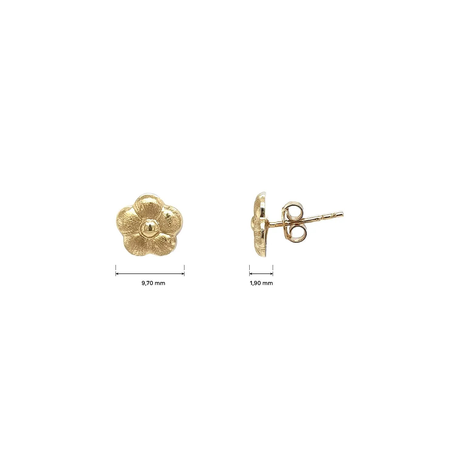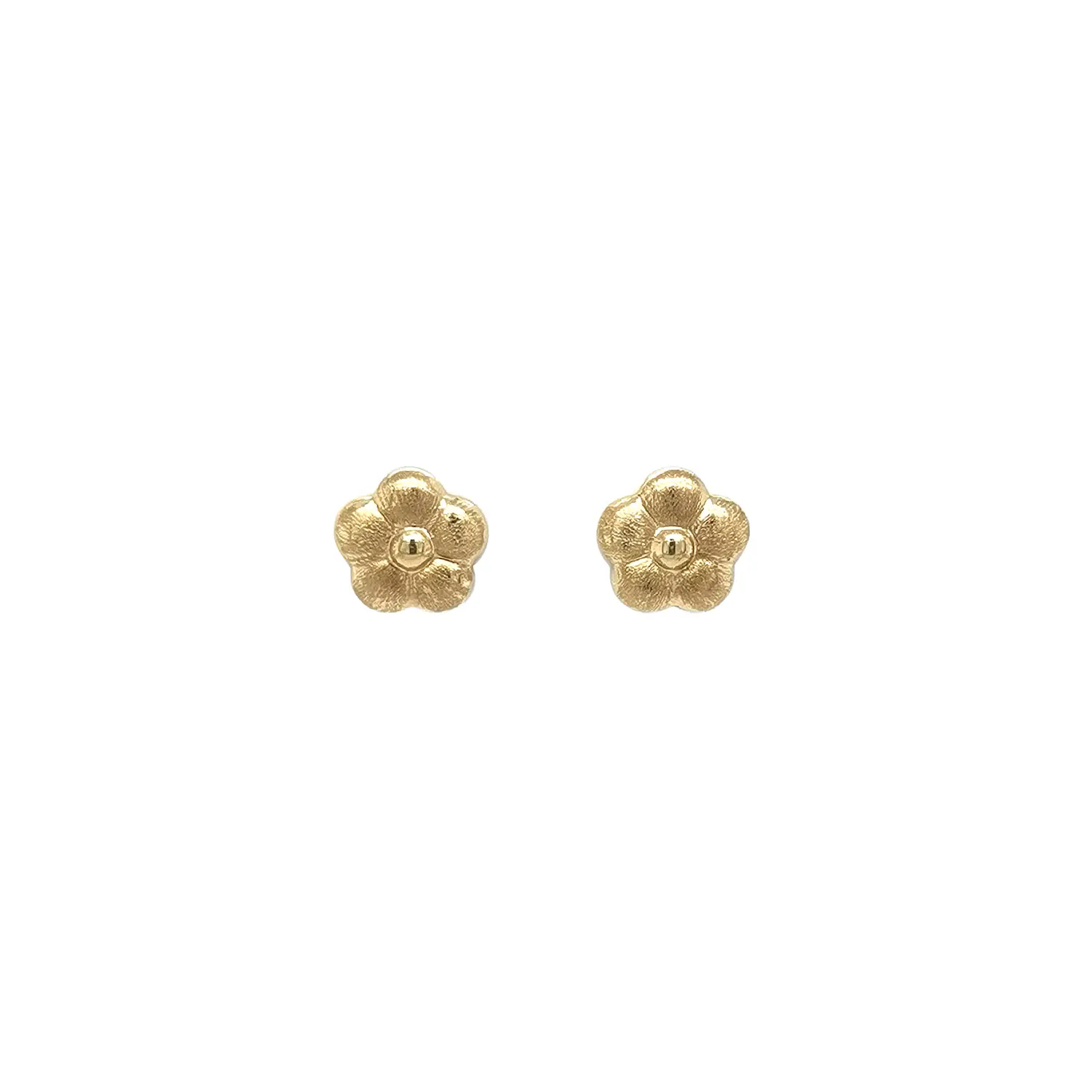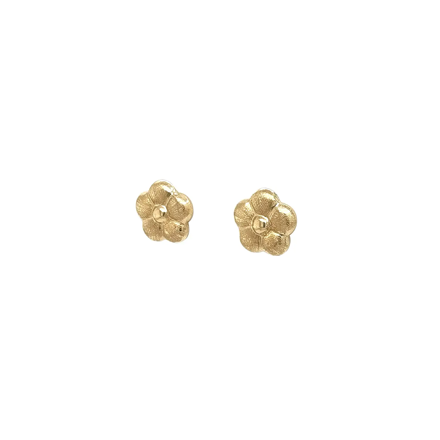 These delicate gold flower stud earrings combine elegance with a playful touch thanks to their matte finish, which highlights the texture of each petal. The polished center adds a subtle contrast and gentle shine. Their small, versatile size makes them suitable for both children and adults.