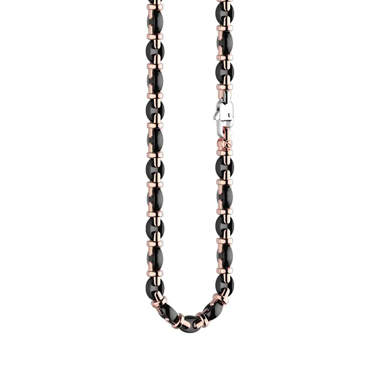 Zancan men’s chain with ceramic blends modern bicolor aesthetics with precise Italian craftsmanship. It stands out with 18kt gold (750/1000) in a white & rose bicolor finish and a polished surface, giving the piece a sophisticated, masculine look. With a 60 cm length, it feels balanced and wears well solo or layered with other accessories.