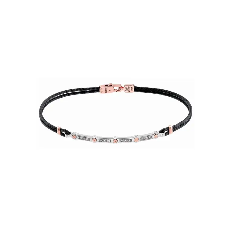 The Zancan men’s bracelet with diamonds blends modern bicolor aesthetics with precise Italian craftsmanship. It stands out with 18kt gold (750/1000) in a white & rose bicolor and polished finish. The flexible cord-style bracelet construction adapts comfortably to the wrist and looks elegant with both casual and formal outfits—a versatile everyday accessory.