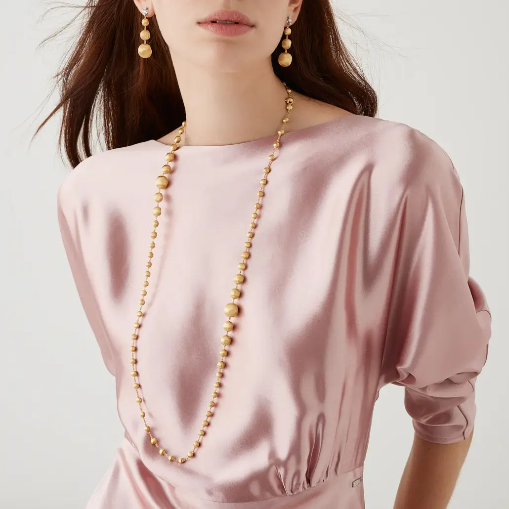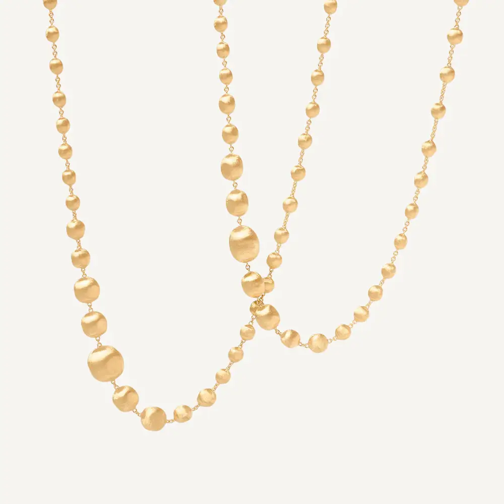 This exceptional gold necklace from the Marco Bicego Africa collection is crafted from 18kt yellow gold (750/1000)and finished with the brand’s iconic matte texture, giving the piece a velvety, luxurious appearance. With its impressive 92 cm length, it allows versatile styling — wear it long, doubled, or layered for a chic, contemporary look.