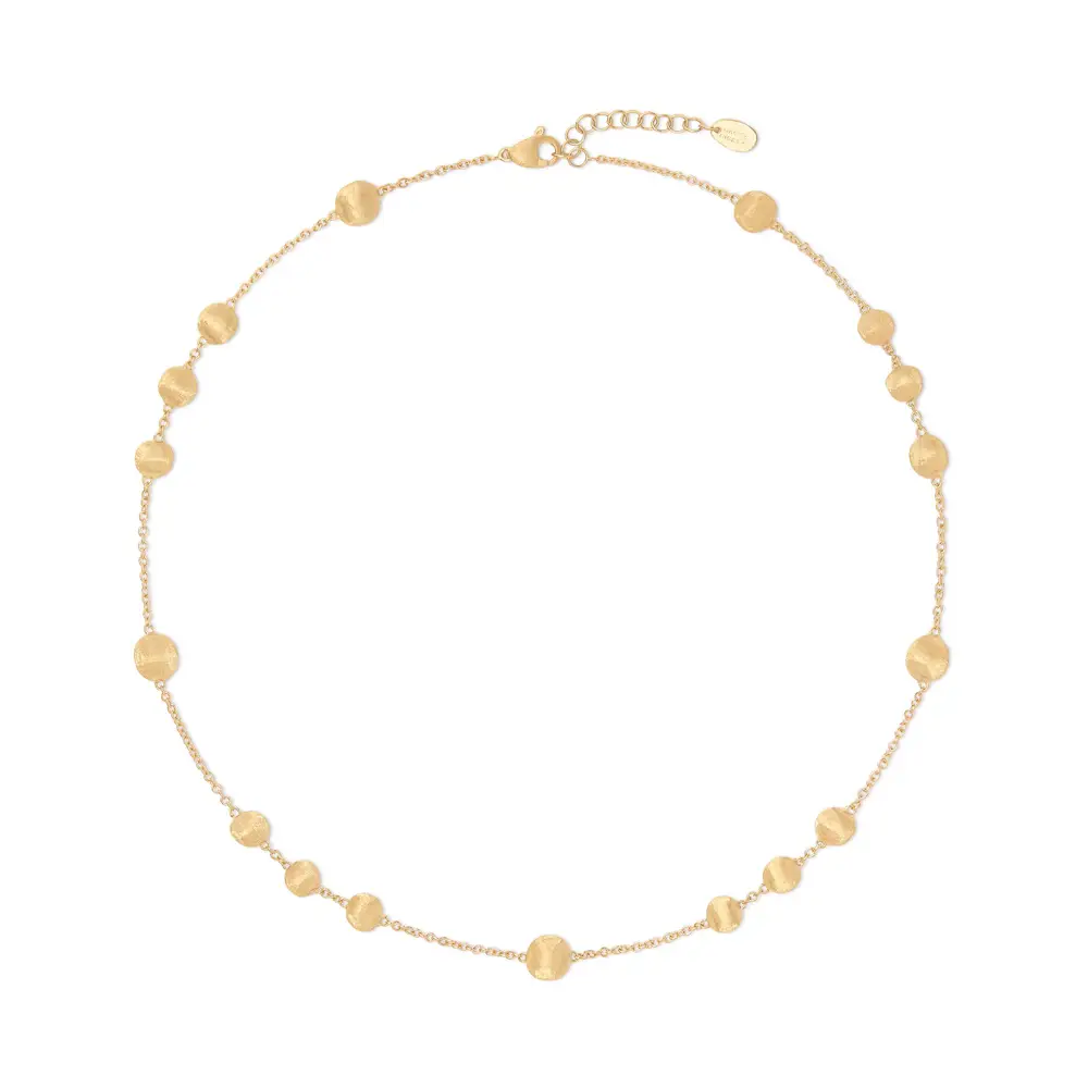 The Marco Bicego Africa CB2830 Y necklace represents Italian elegance and artisanal mastery. Crafted from 18kt (750/1000) yellow gold with a combination of polished and matte finishes, it reveals a refined texture that feels both natural and luxurious. Measuring 42 cm, it sits gracefully on the neckline, perfect for both everyday wear and special occasions.