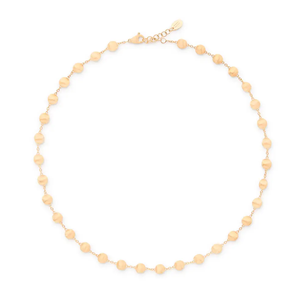 Part of the Africa collection, the necklace draws inspiration from the natural shapes and tones of African landscapes. Each bead-like element is hand-sculpted from gold, creating a textured surface that captures light and reveals the duality of shine and softness. The result is a fluid and organic rhythm that defines Marco Bicego’s signature style.