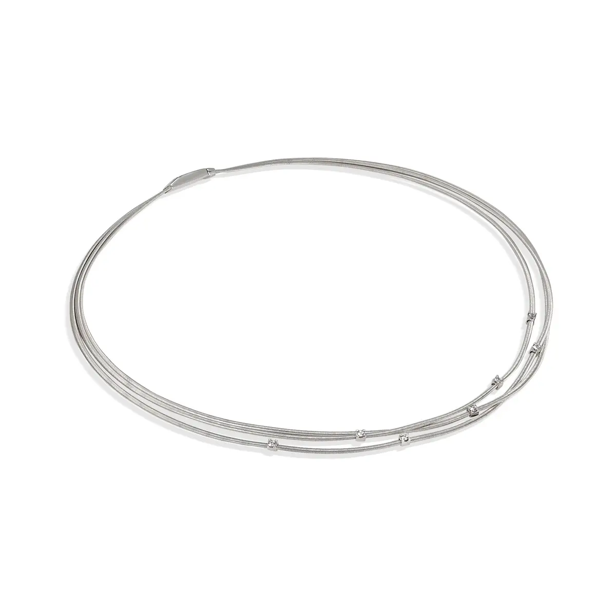 The Marco Bicego Goa CG617 B W 01 necklace is a refined expression of Italian craftsmanship and contemporary design. Crafted from 18kt (750/1000) white gold with a polished and matte finish, it combines understated sophistication with timeless allure. Measuring 41 cm, it sits elegantly on the neckline, making it a versatile and luxurious accessory.