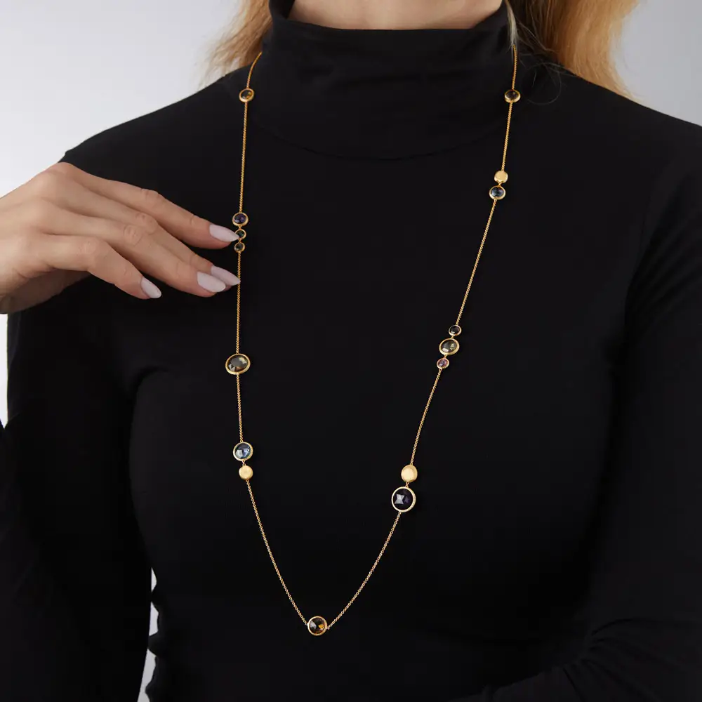 The Marco Bicego Jaipur CB1401 MIX01 Y necklace embodies the perfect balance between natural beauty and refined craftsmanship. Made from 18kt (750/1000) yellow gold with a polished and matte finish, it radiates warmth and elegance. The generous 92 cm length allows versatile styling – worn long for a graceful look or doubled for added sophistication.