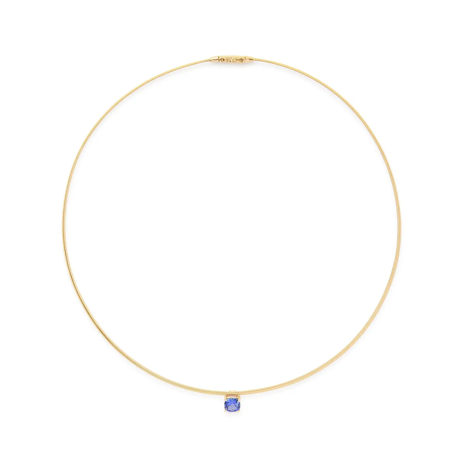 The central element of the necklace is a natural tanzanite, whose distinctive blue-violet color gives the piece a sophisticated and elegant appearance. The gemstone is set in a delicate gold setting and complemented by a slim gold necklace with a smooth and elegant profile, allowing the gemstone to stand out beautifully.