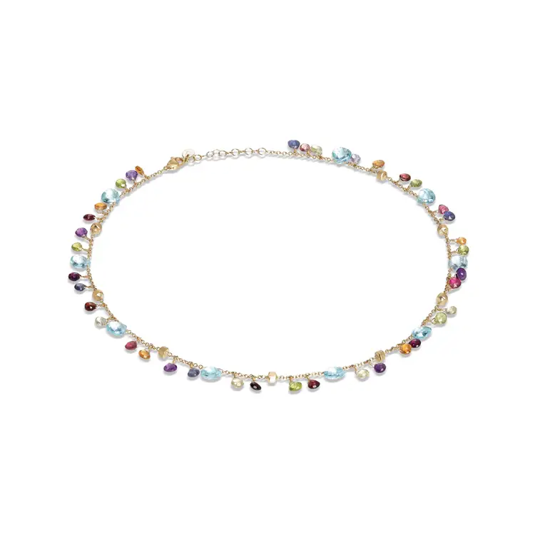 Adorned with 47 natural semi-precious gemstones, each in a vibrant mix of colours, the necklace captures the joyful essence of nature. Every stone is pear-shaped and rose-cut to enhance its brilliance and natural sparkle. The Paradise collection embodies the carefree spirit of sunshine and colour, turning every jewel into a small masterpiece.
