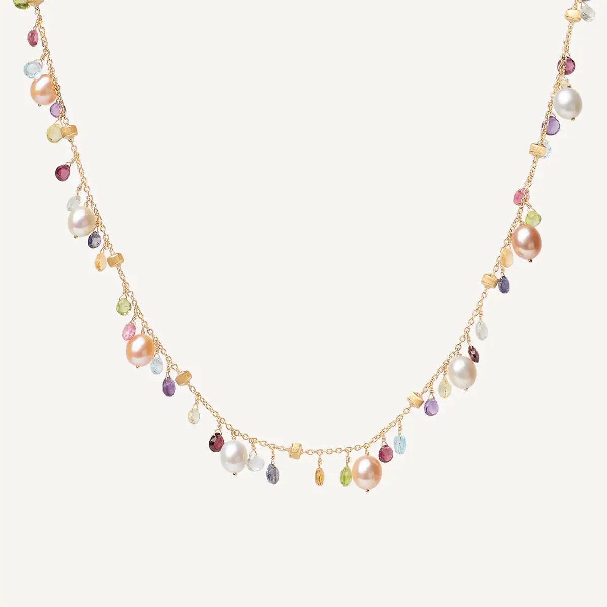 Model CB2584-E MIX114 Y 02 measures approximately 42 cm (16.5″) with an extension up to 18″, allowing the necklace to elegantly follow the neckline. The combination of 18k gold, a vibrant selection of natural gemstones, freshwater pearls, and precise Italian craftsmanship by Marco Bicego creates a timeless piece suitable for everyday wear as well as an exclusive gift.