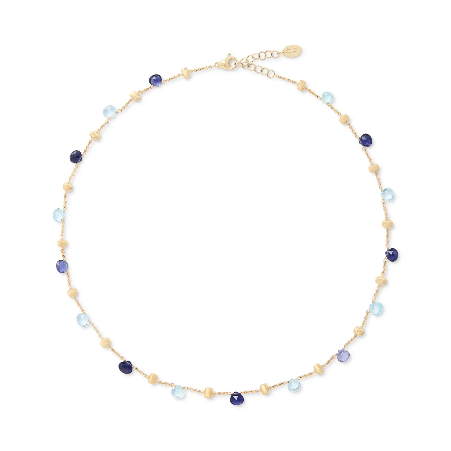 The luxurious Marco Bicego Paradise CB765-E MIX240 Y gold necklace is crafted from 18k yellow gold (750/1000) and belongs to the iconic Paradise collection, celebrating the vibrant colors of natural gemstones. The necklace combines a delicate gold chain with colorful gemstones, creating a playful yet elegant composition inspired by natural shades.