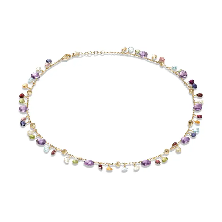 The Marco Bicego Paradise Necklace with Semi-Precious Stones is a true expression of Italian artistry and natural elegance. Crafted in 18 kt (750/1000) yellow gold with a polished and matte finish, it embodies the balance between sophistication and warmth. Measuring 42 cm, it rests beautifully along the neckline.