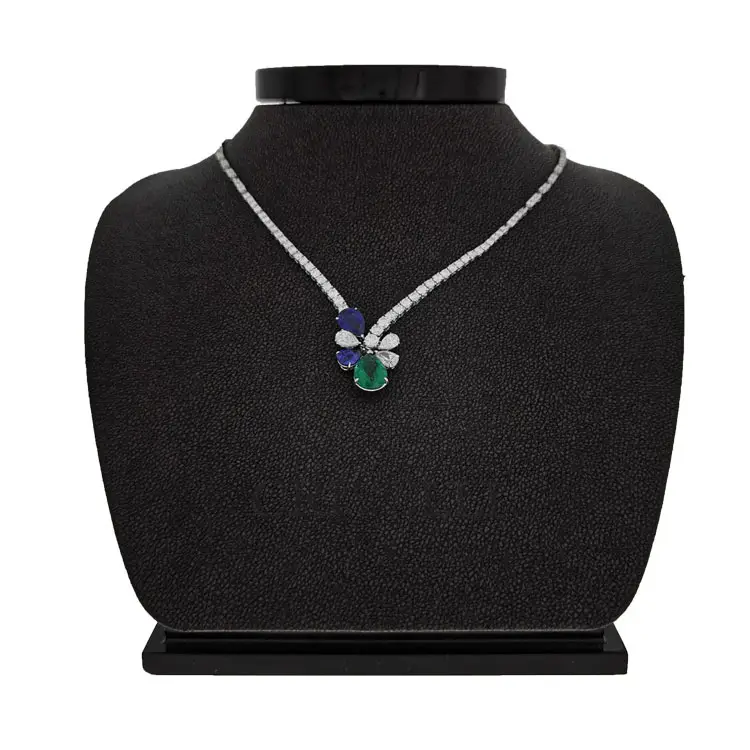 At the heart of the composition is an emerald, 2.38 ct (1 pc), deep green, natural origin, flanked by a pair of sapphires, 2.84 ct (2 pcs), royal blue, natural origin. Added fire comes from natural diamonds 1.22 ct (3 pcs), VS clarity, F color, and a rich border of 126 natural diamonds, 5.15 ct, SI clarity, F color—together emphasizing the depth of the colored stones and the necklace’s luxurious character. The result is a timeless, feminine, and dazzling necklace that becomes the center of attention.