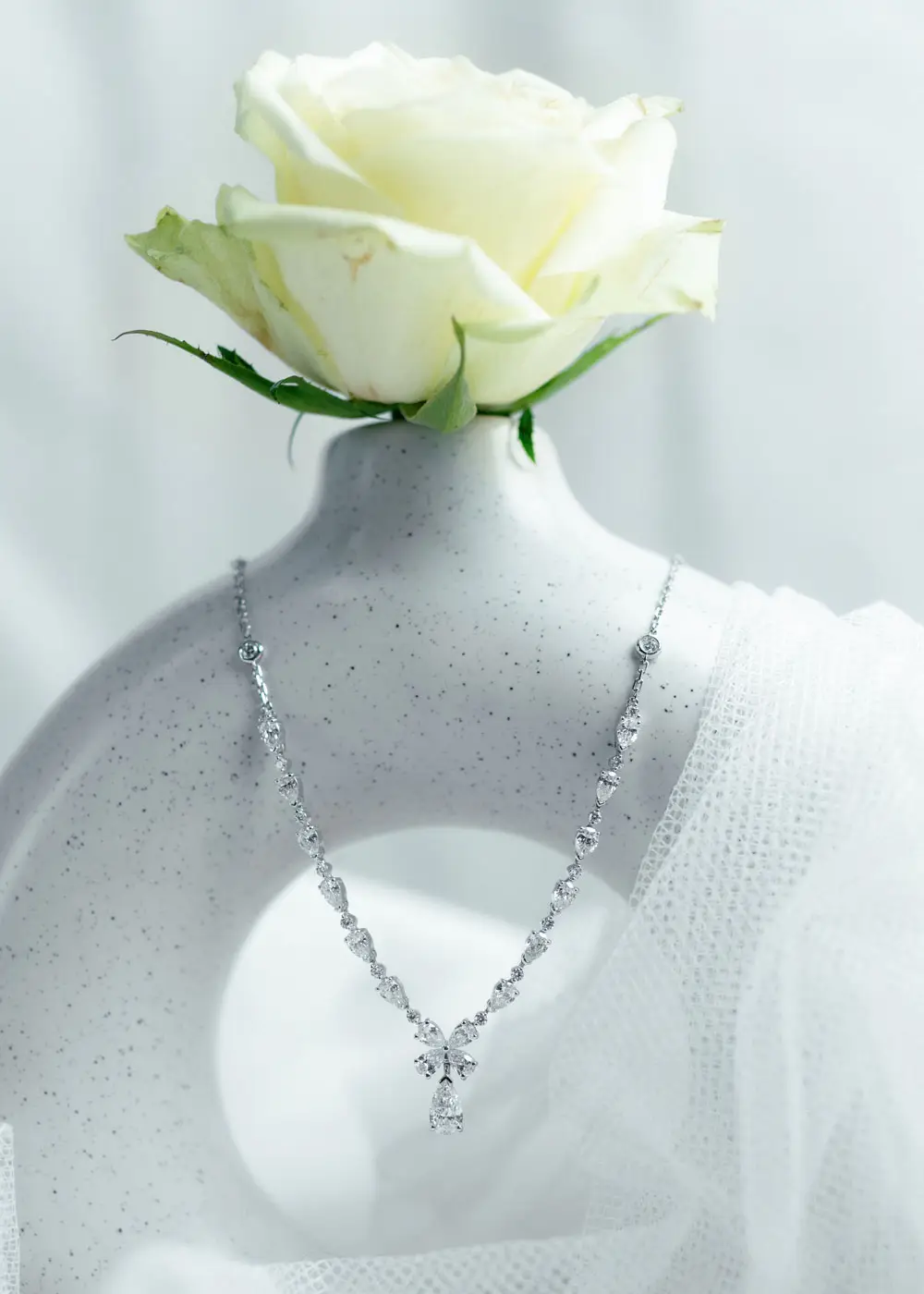 At its heart shines a natural pear-shaped diamond of 0.70 ct, color F, and clarity VS — a true symbol of refined brilliance. Surrounding it are four additional pear-cut diamonds totaling 0.40 ct, and a magnificent arrangement of twelve larger pear-cut diamonds weighing 3.00 ct in D color and SI1 clarity. Completing the design are twelve round-cut accent diamonds (0.25 ct total), which enhance the necklace’s radiance and add depth to its overall sparkle.