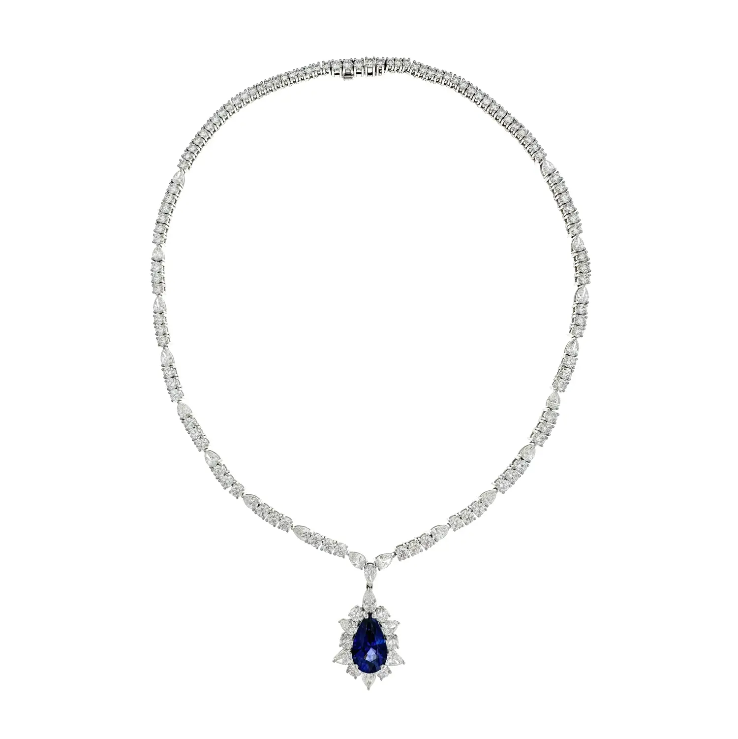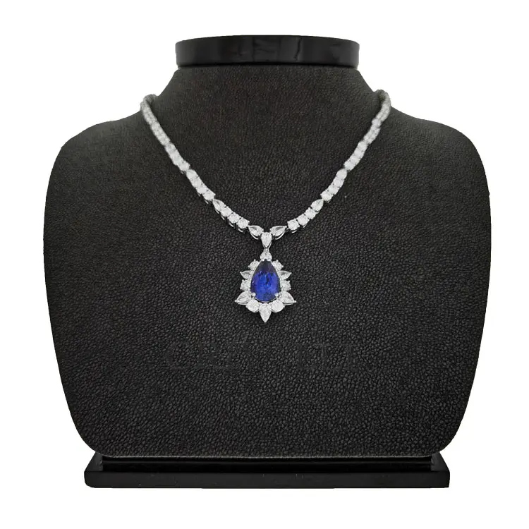 The Beny Jewellery sapphire and diamond necklace is a masterpiece of regal grace and meticulous artistry. At its heart rests a natural 8.17 ct pear-shaped sapphire, radiating a profound blue hue that evokes depth, wisdom and serenity. Surrounded by an intricate halo of diamonds, it captures the perfect equilibrium between power and poise.