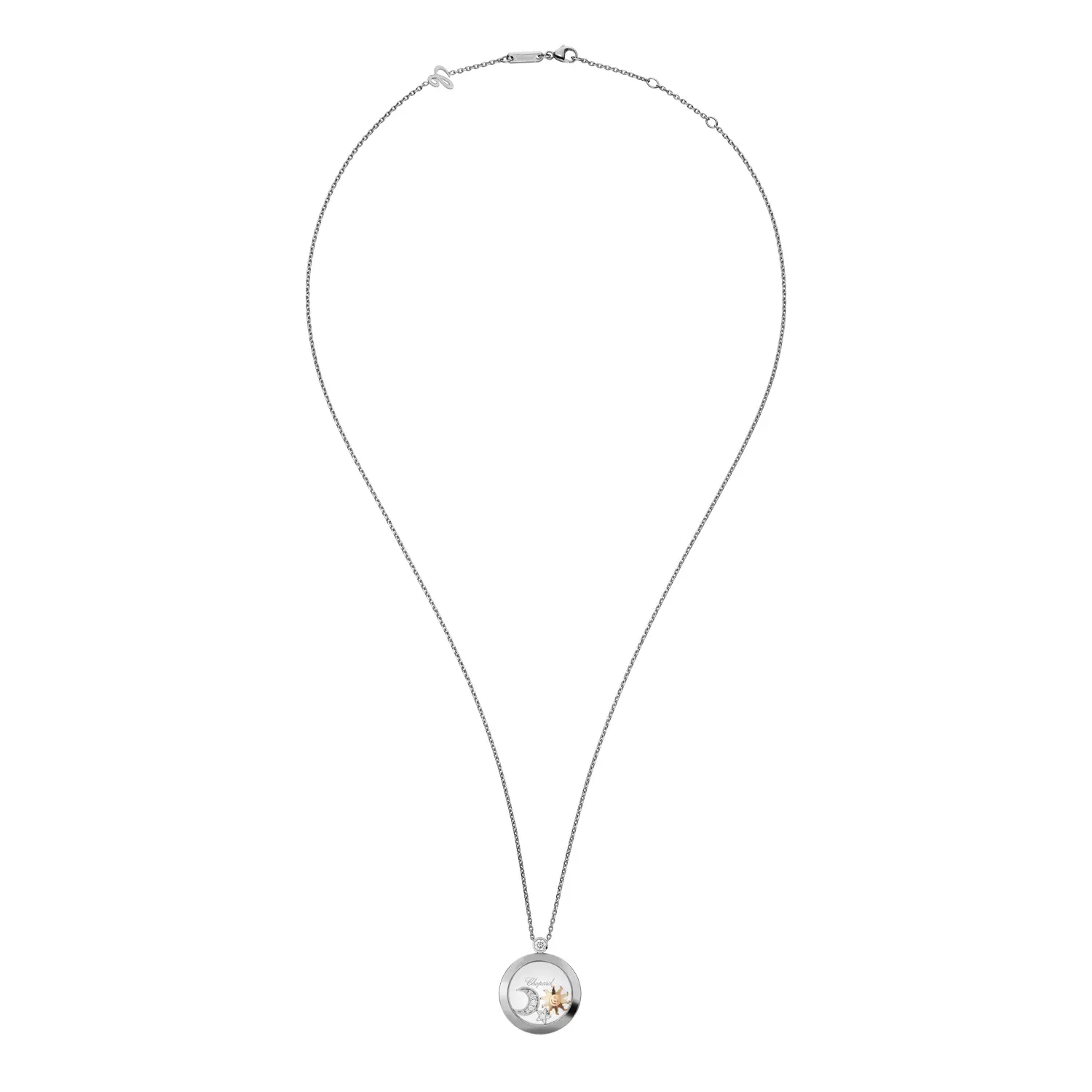 The Chopard Happy Sun, Moon and Stars 799434-1201 pendant celebrates celestial beauty and the joy of life. Crafted from ethical 18-carat white gold, it features a delicate round shape with freely moving diamonds dancing between two sapphire crystals – the signature “Happy Diamonds” effect symbolizing freedom, light, and vitality.