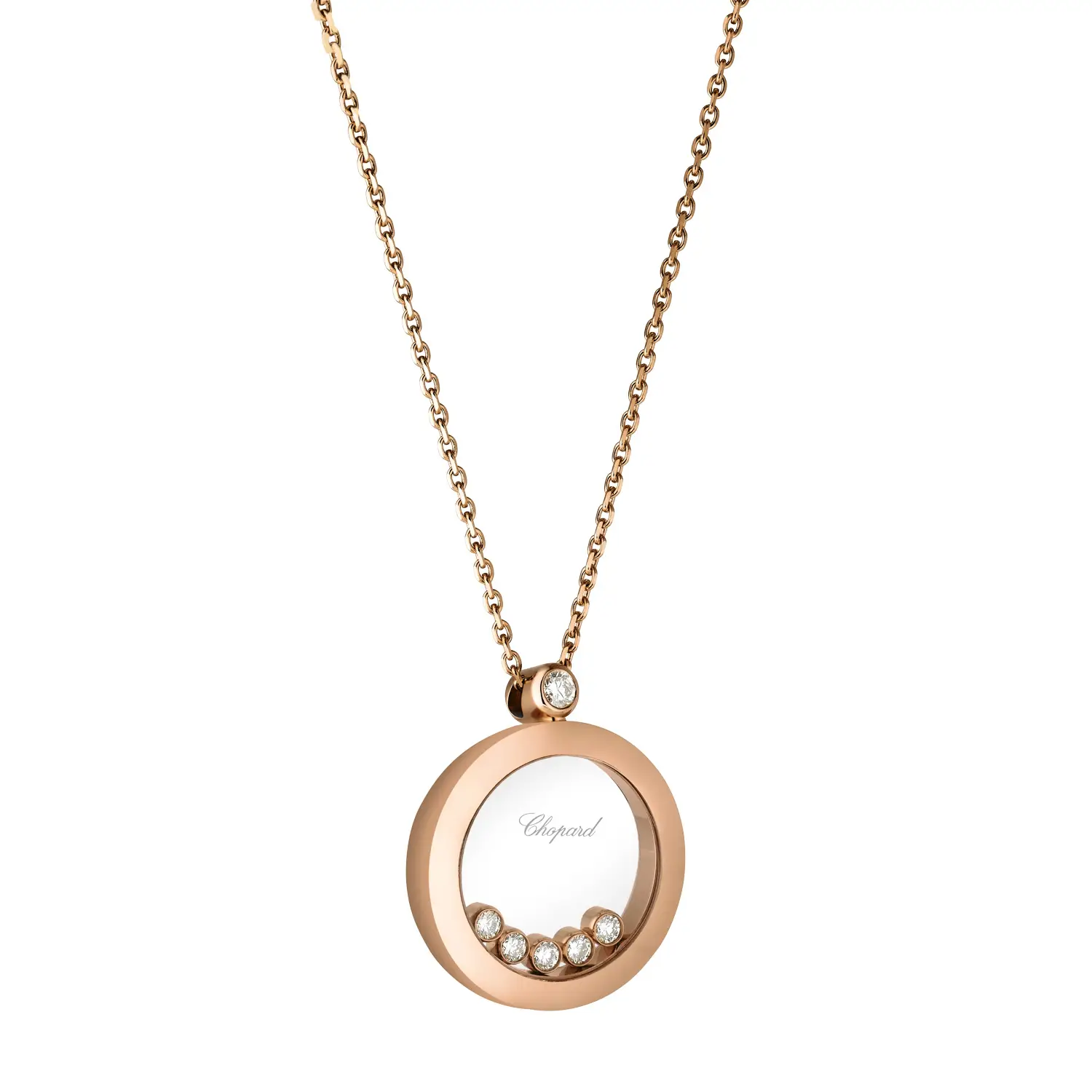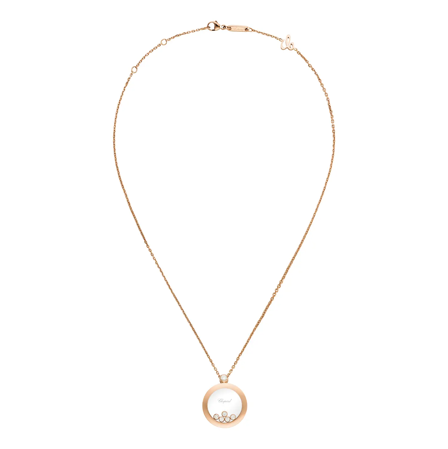 The Chopard Happy Diamonds Icons 799434-5001 necklace embodies pure feminine elegance and joy. Crafted from ethical 18-carat rose gold, its circular pendant encloses three freely moving diamonds (total 0.35 ct) between sapphire crystals – the signature “dancing diamonds” that symbolize freedom and happiness in Chopard’s iconic Happy Diamonds collection.