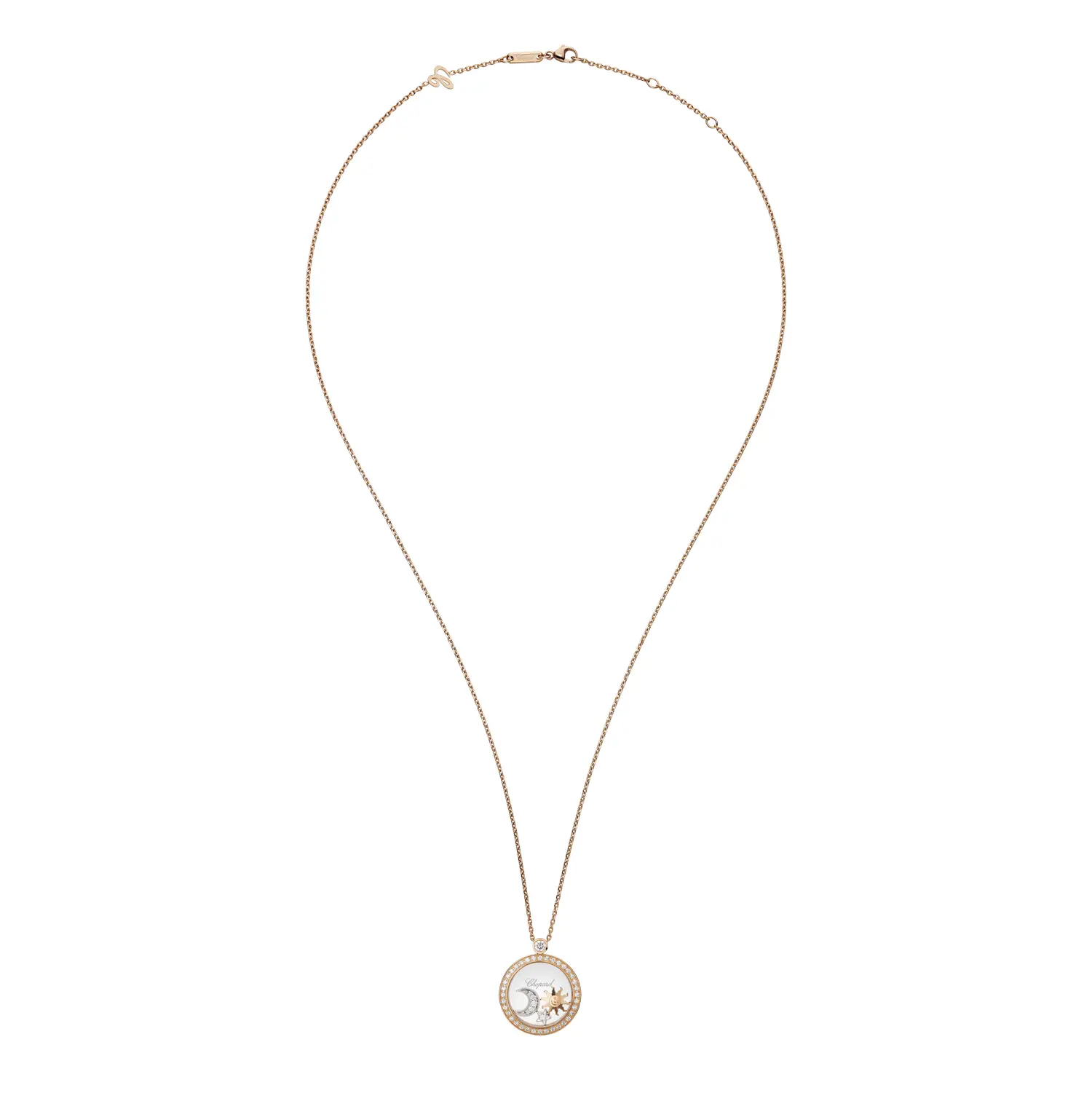 The Chopard Happy Sun, Moon and Stars 799434-5401 pendant celebrates joy, light, and celestial beauty. Crafted from ethical 18-carat rose gold, it features a round pendant where freely moving diamonds dance between two sapphire crystals, creating the signature “Happy Diamonds” effect — a symbol of freedom, grace, and radiant emotion.