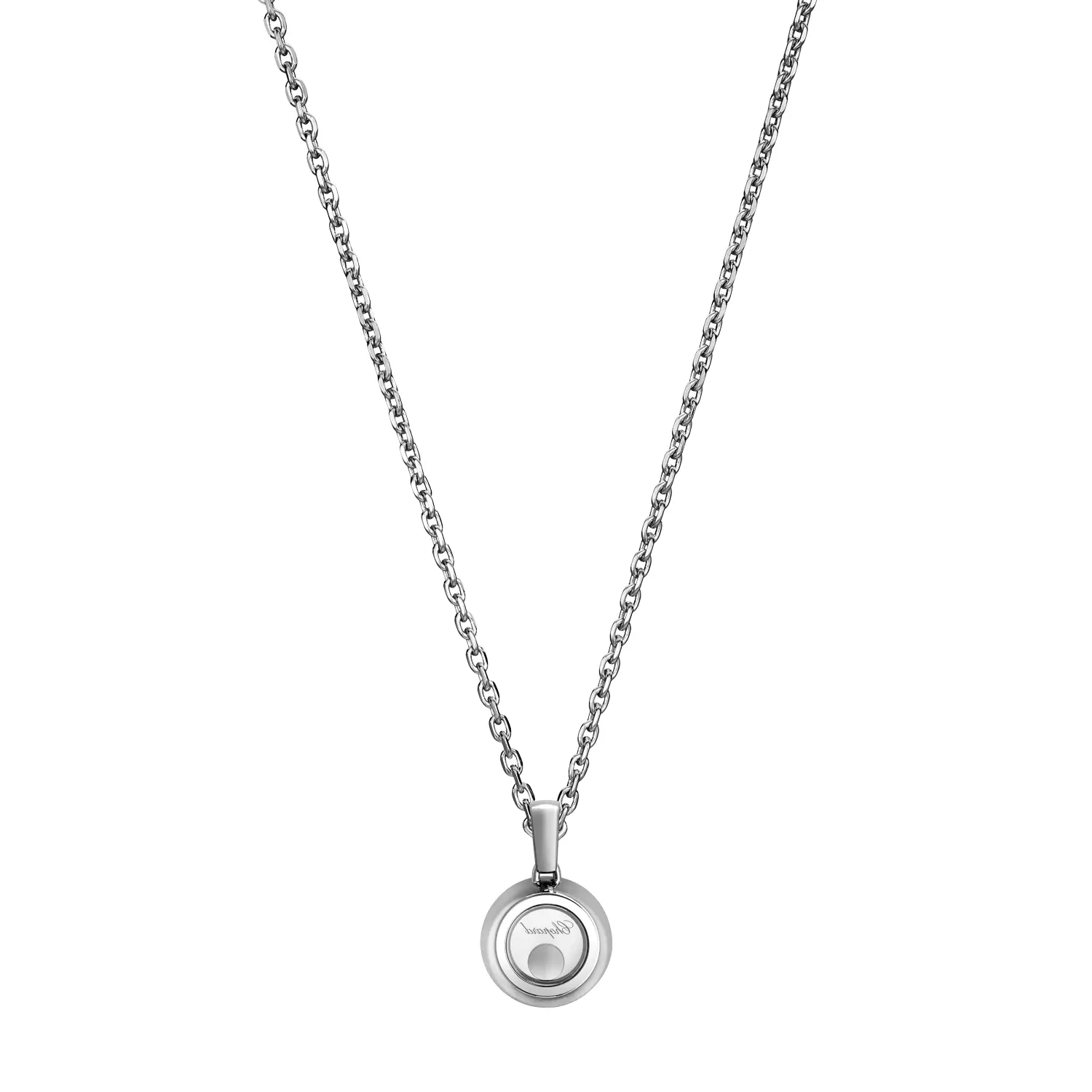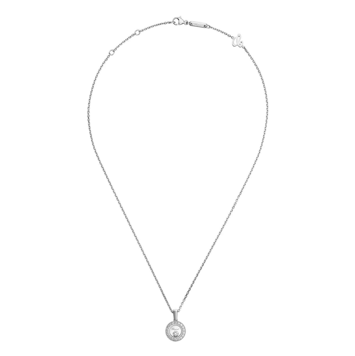 Crafted in 18kt white gold, the pendant features three freely moving diamonds encased between two sapphire crystals. These floating gems sparkle brilliantly with every motion, symbolizing happiness and vitality – hallmarks of Chopard’s joyful spirit. The polished white gold finish highlights the brand’s exquisite craftsmanship.