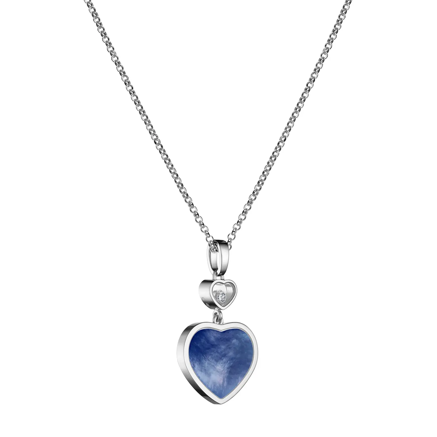 The highlight of the design is the signature heart duo from the Happy Hearts collection — the larger heart is adorned with natural blue mother-of-pearl, heart-shaped, adding depth, a gentle luster, and symbolizing tranquility and balance. The smaller heart creates a refined contrast, completing the impression of luxury and craftsmanship.