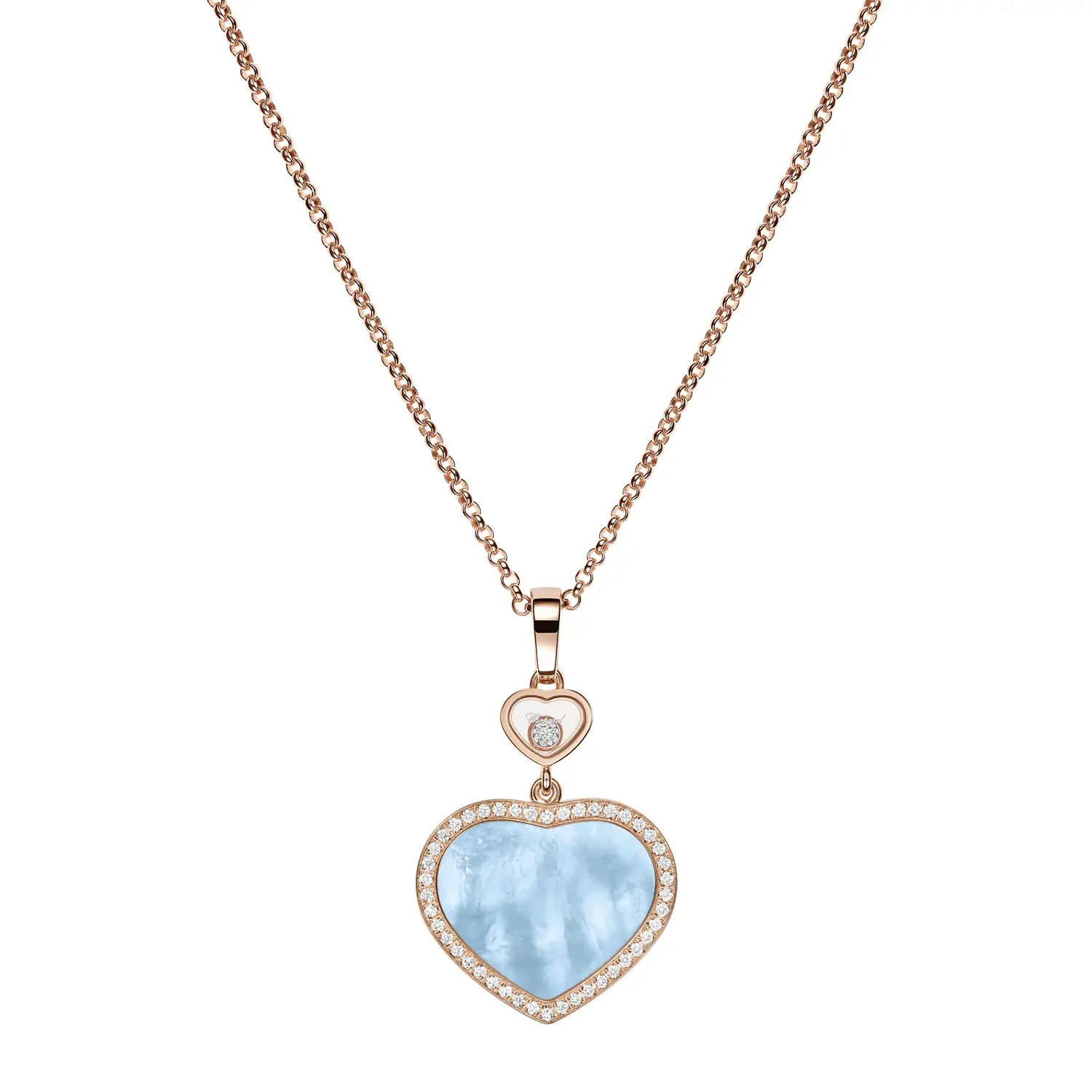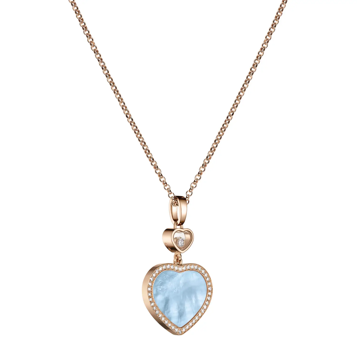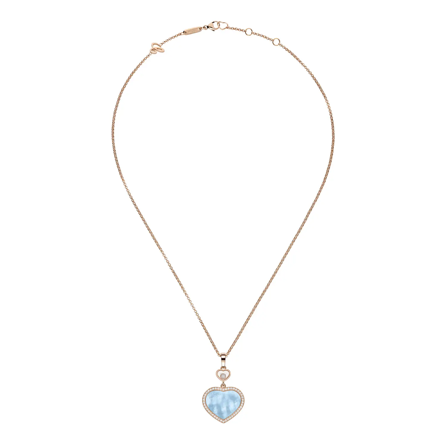 At the center of the pendant is the signature heart motif, with the larger heart adorned by a natural turquoise mother-of-pearl in heart shape — a color that evokes freshness, harmony, and originality. This soft yet striking stone gives the pendant a unique appearance and gentle glow. Surrounding the mother-of-pearl heart are 45 round natural diamonds, each with IF clarity and F–G color, adding a dazzling brilliance with every movement.