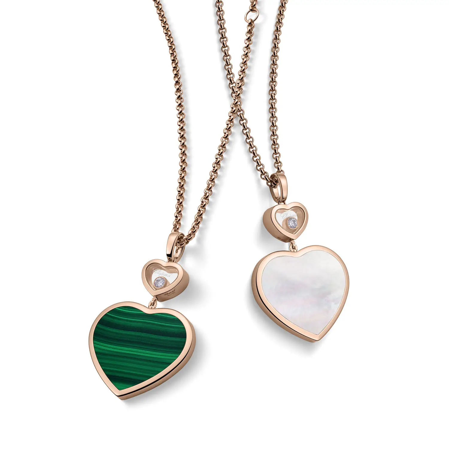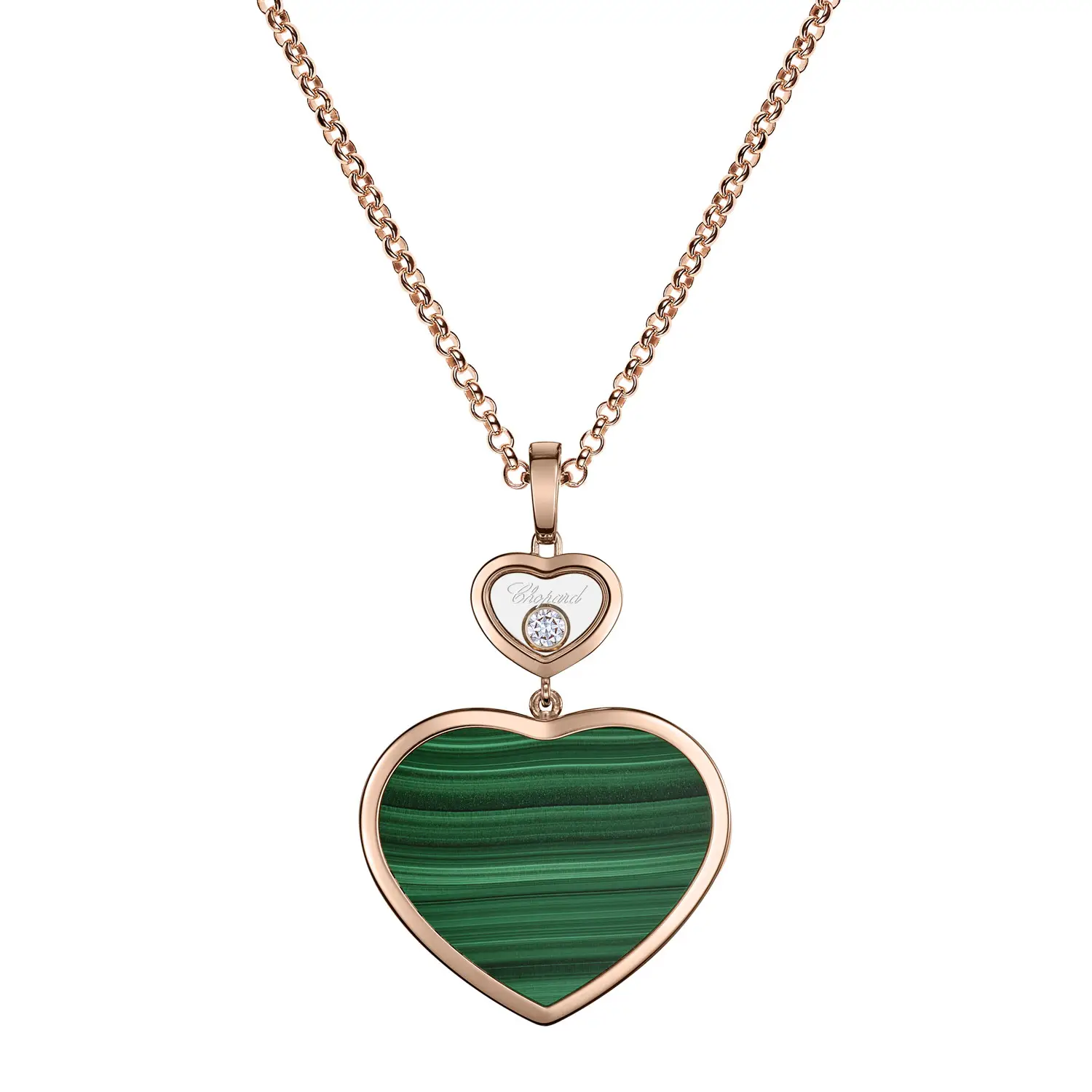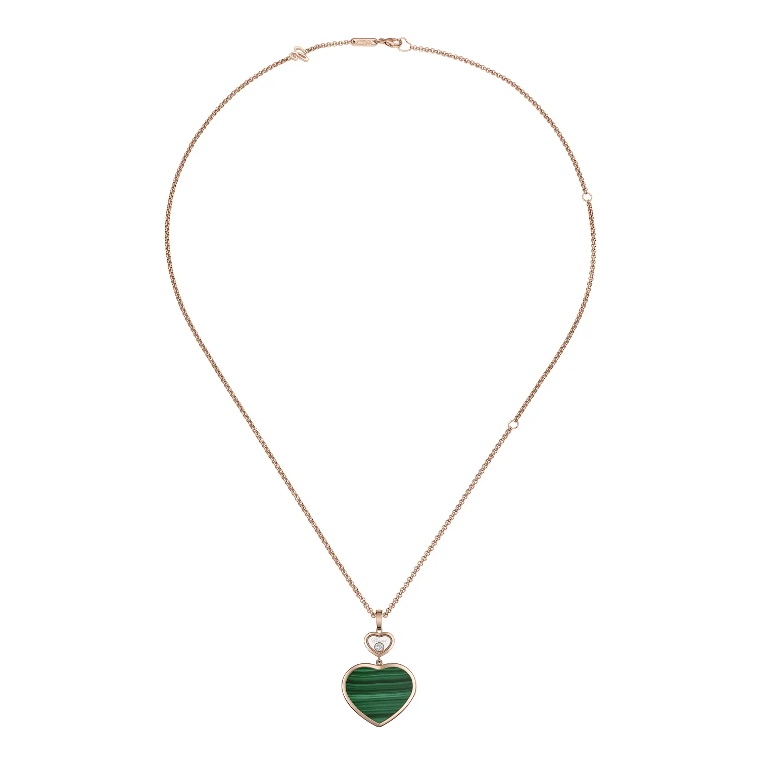 The Chopard Happy Hearts 79A075-5151 pendant unites playfulness, elegance, and refined luxury. Crafted from ethical 18-carat rose gold, it features a malachite heart – a stone symbolizing harmony and positive energy – and a brilliant 0.10 ct diamond. The balance of warm gold, green gemstone, and sparkling diamond creates a look of modern femininity.