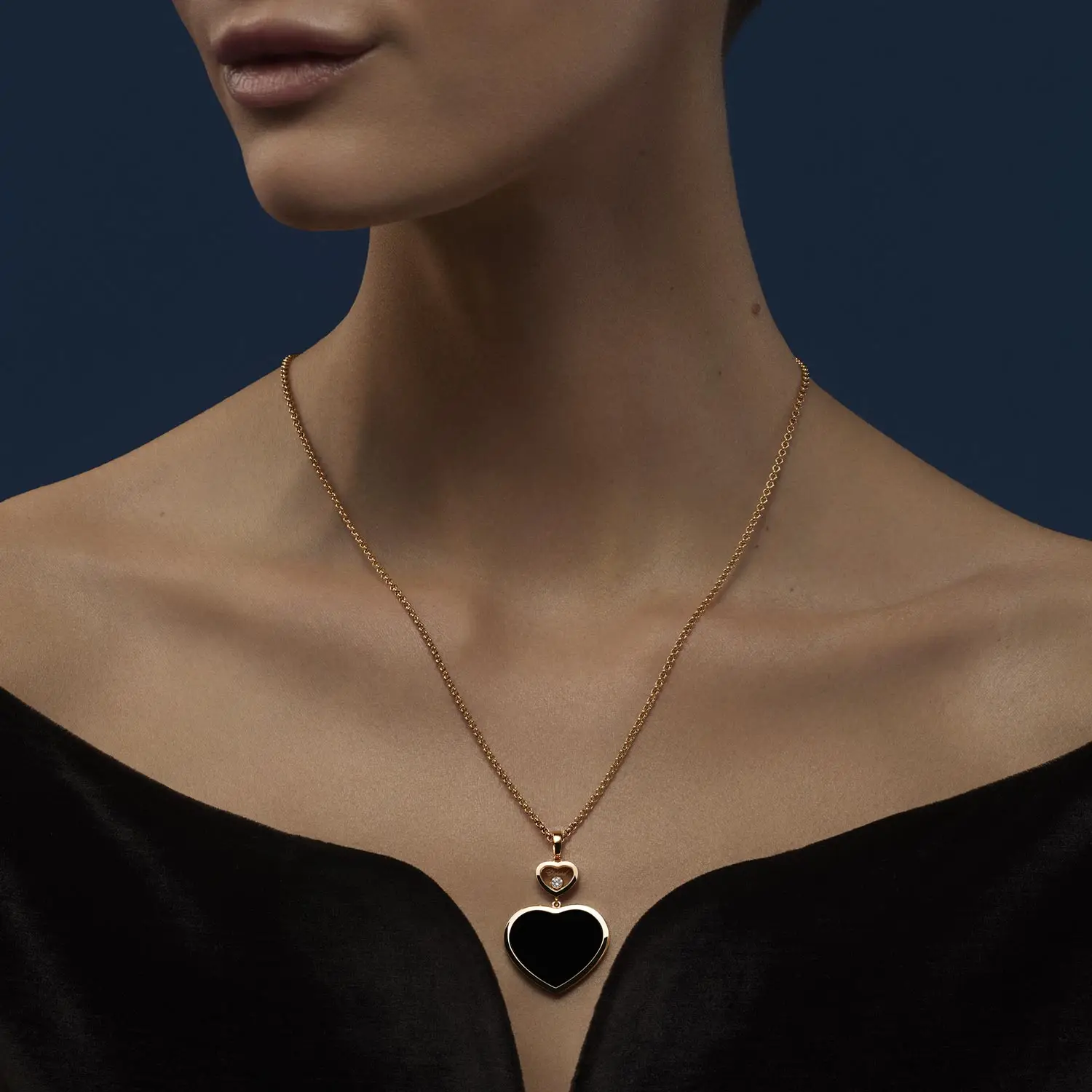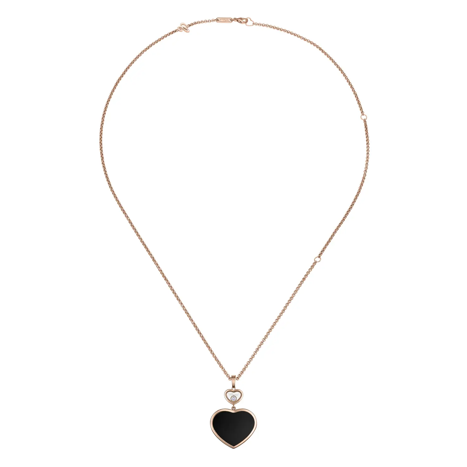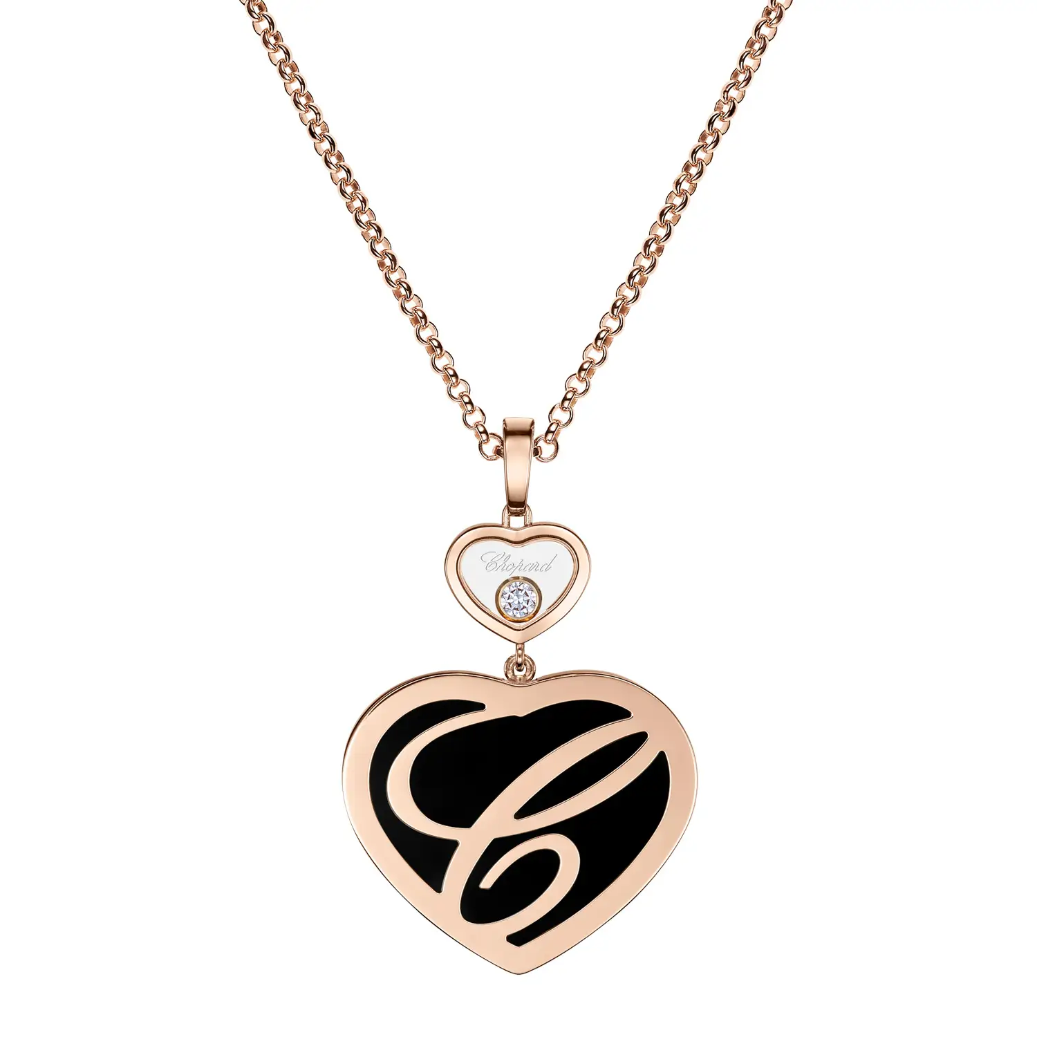 One side features a striking natural heart-shaped onyx, whose deep black color creates a refined contrast with the warm hue of rose gold. The other side is adorned with a single freely moving diamond, set inside a smaller heart. This natural round diamond, graded IF clarity and F-G color, sparkles with exceptional brilliance and purity.