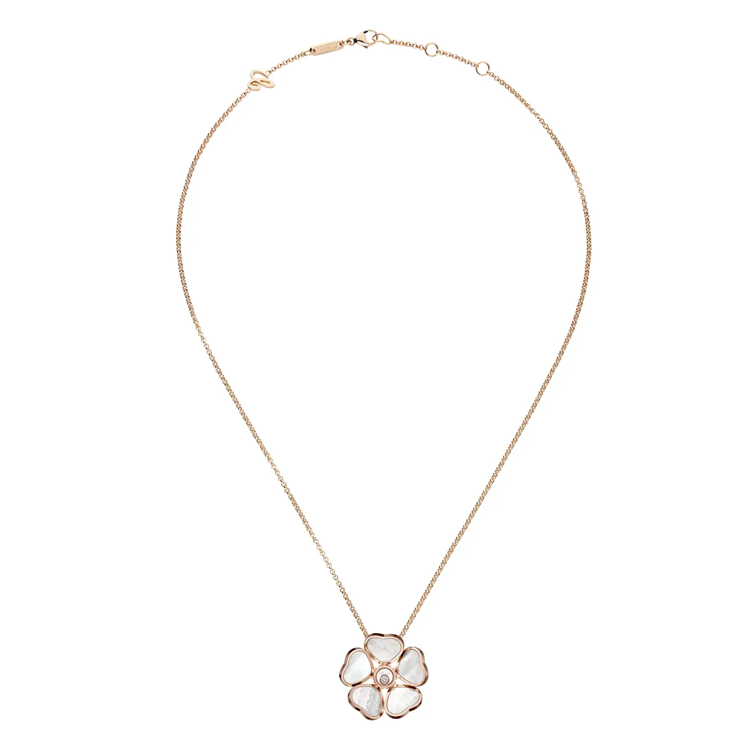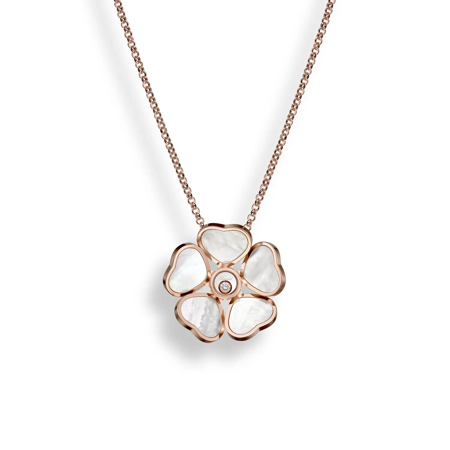 The Chopard Happy Hearts Flowers 79A085-5301 pendant celebrates joy, love, and feminine grace. Crafted from ethical 18-carat rose gold, it features a delicate flower motif formed by five hearts surrounding a freely moving diamond. This signature “Happy Diamonds” effect brings brilliance and vitality, symbolizing freedom and optimism at the heart of the Happy Hearts collection.