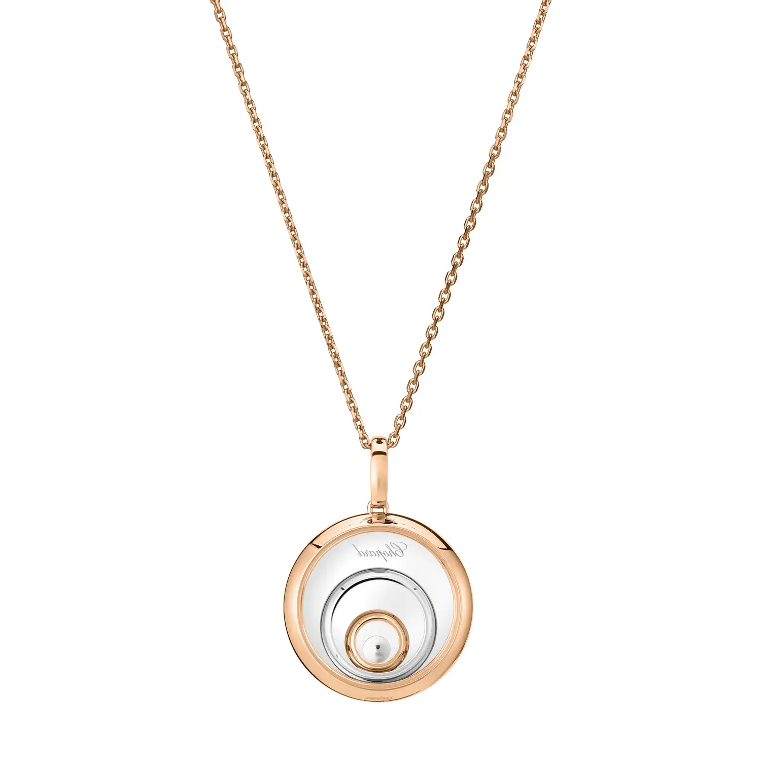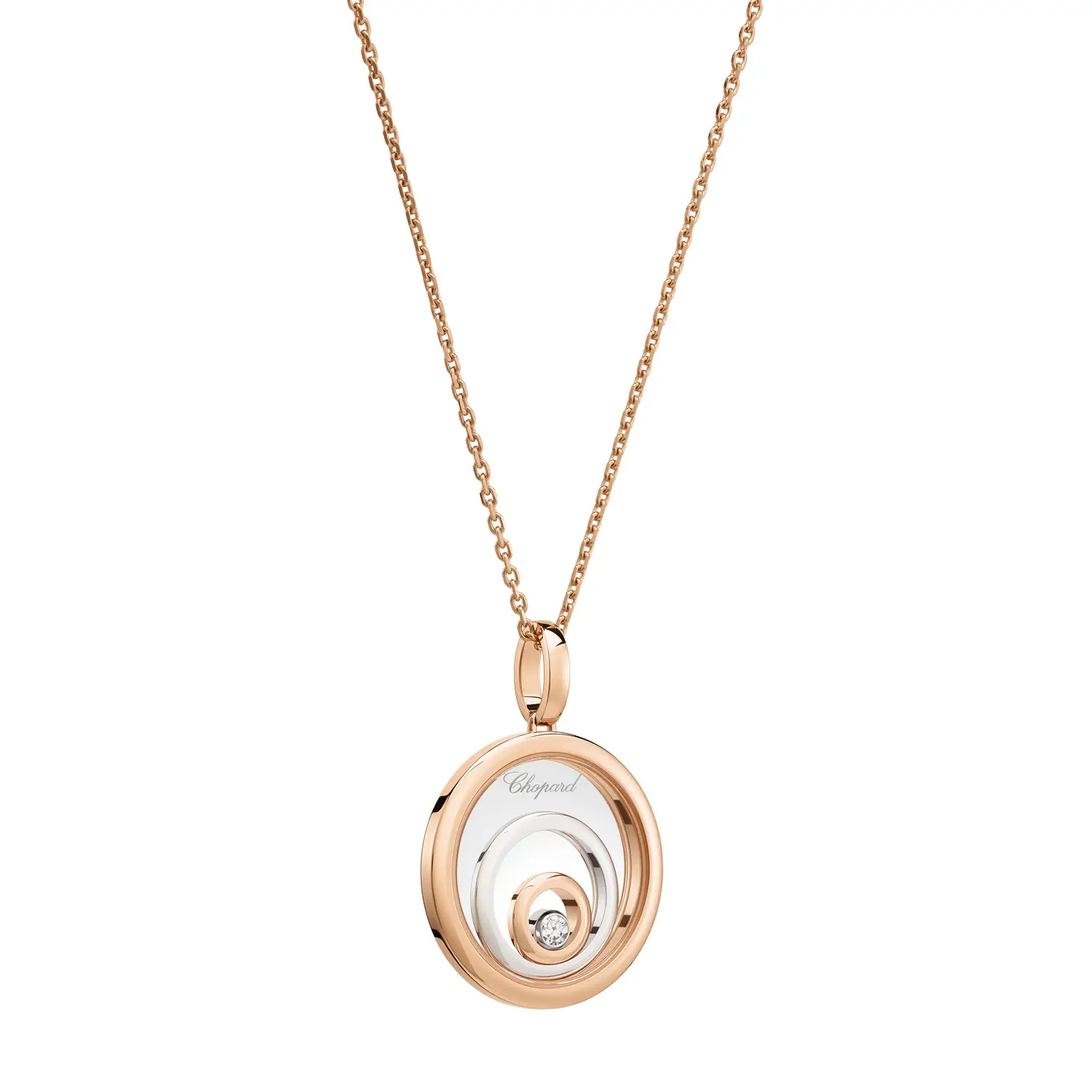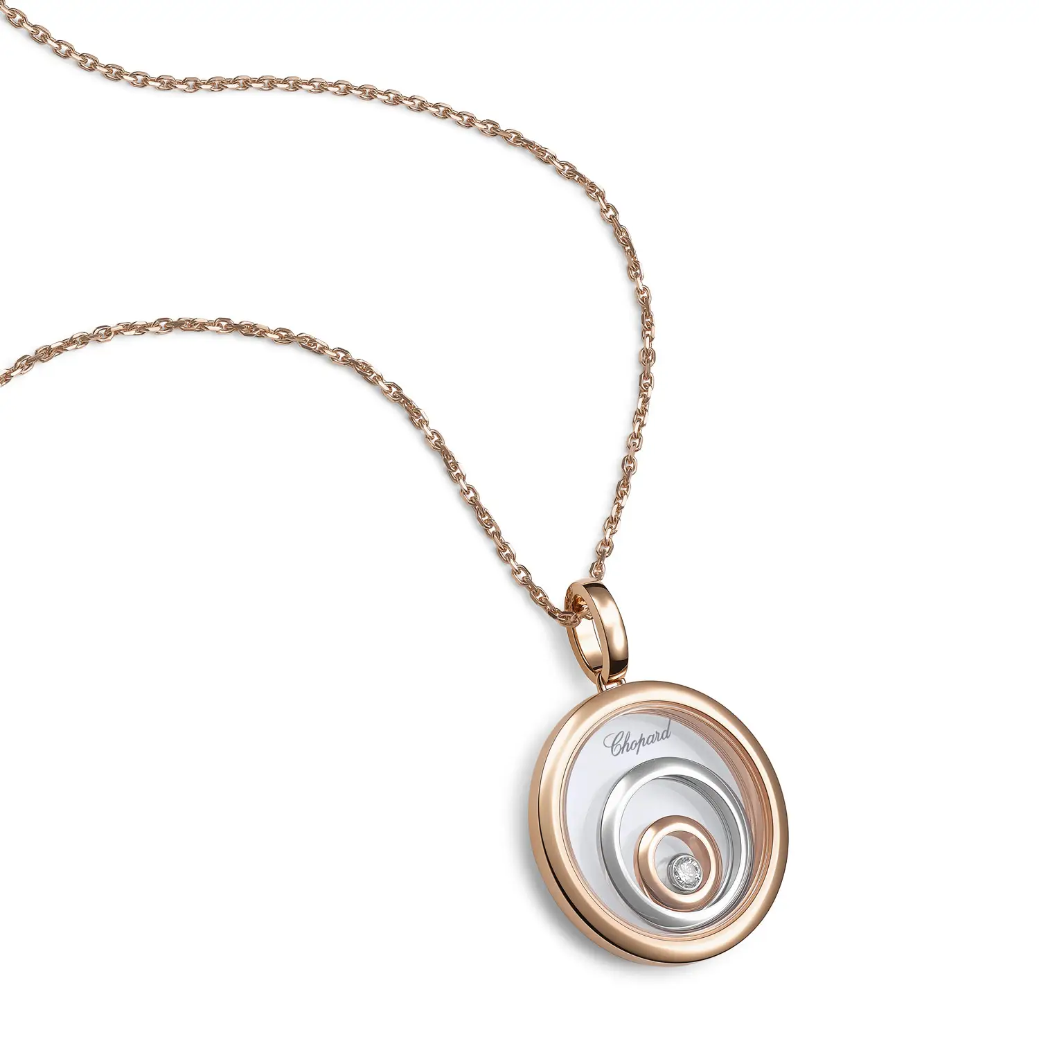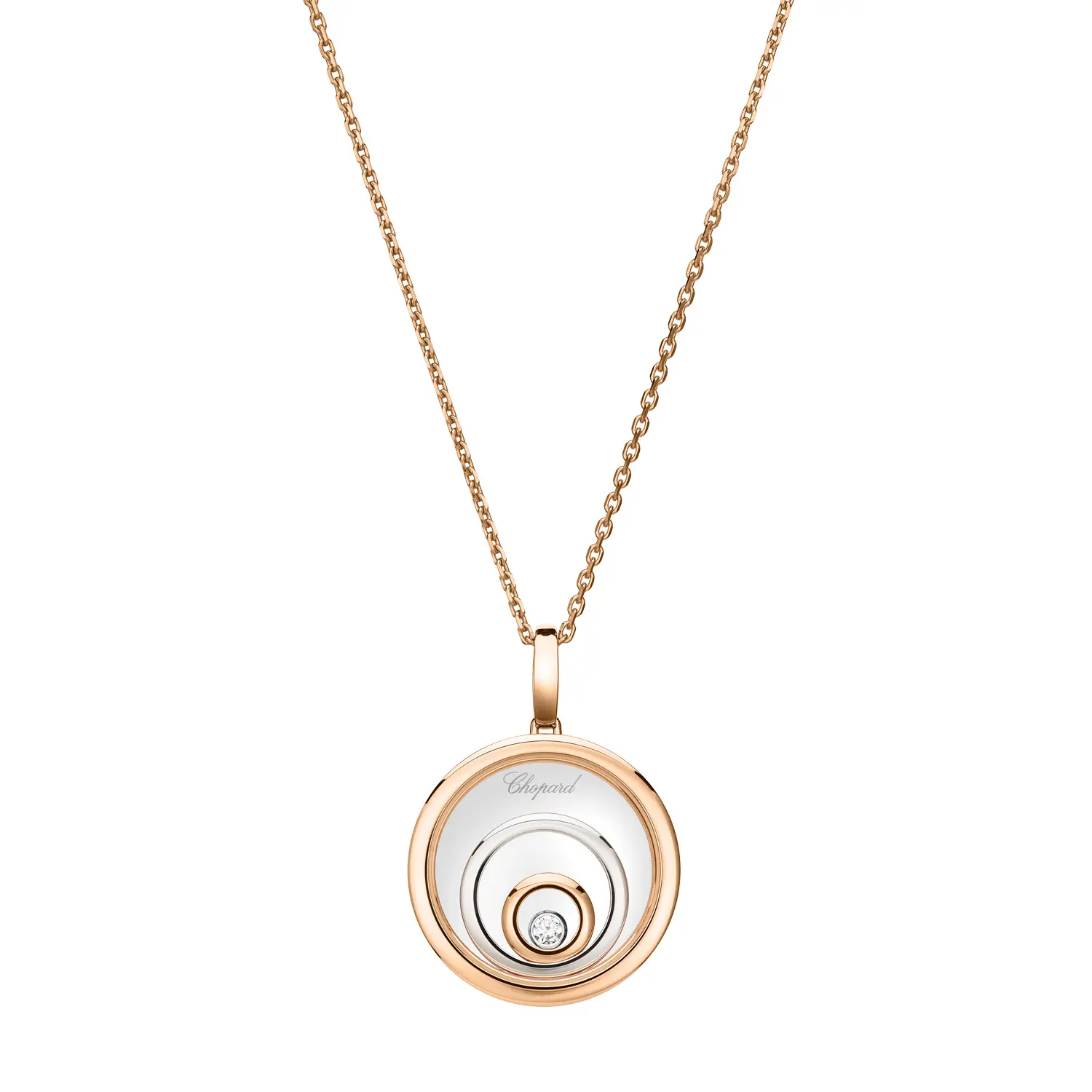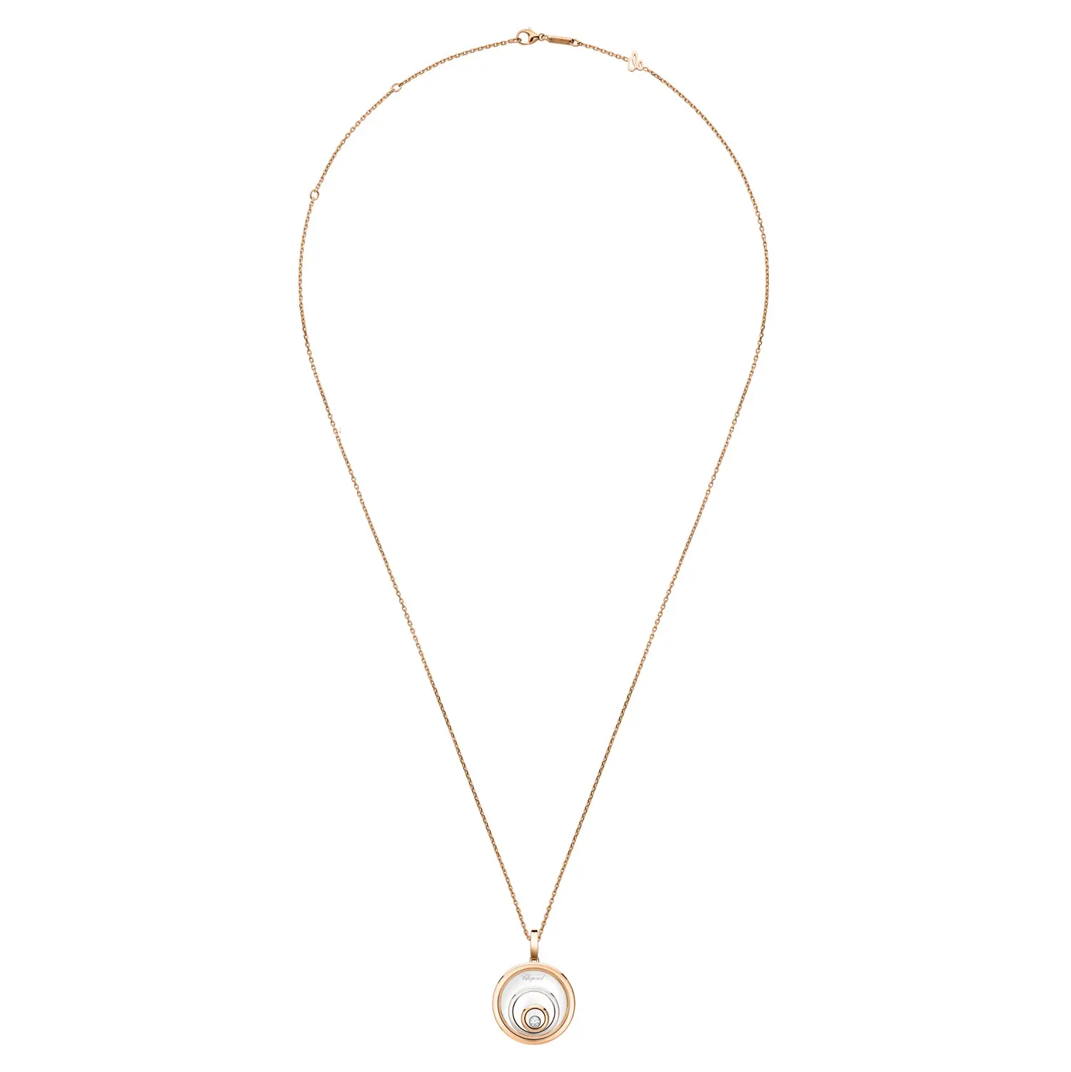 The Chopard Happy Spirit 798231-9001 pendant captures harmony, light, and motion — the essence of the Happy Spirit collection. Crafted from a blend of ethical 18-carat rose and white gold, it features concentric circles symbolizing serenity and balance. At its center, a freely moving diamond (0.09 ct) dances between sapphire crystals, creating the iconic “Happy Diamonds” effect that celebrates freedom and joy.