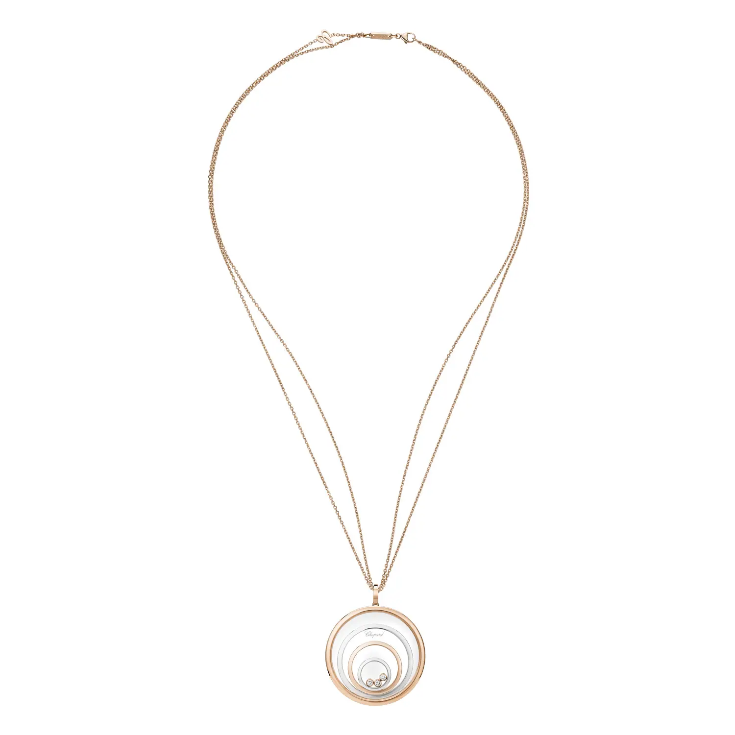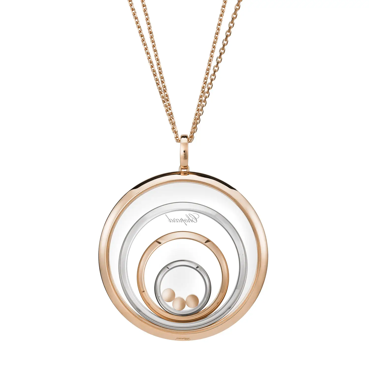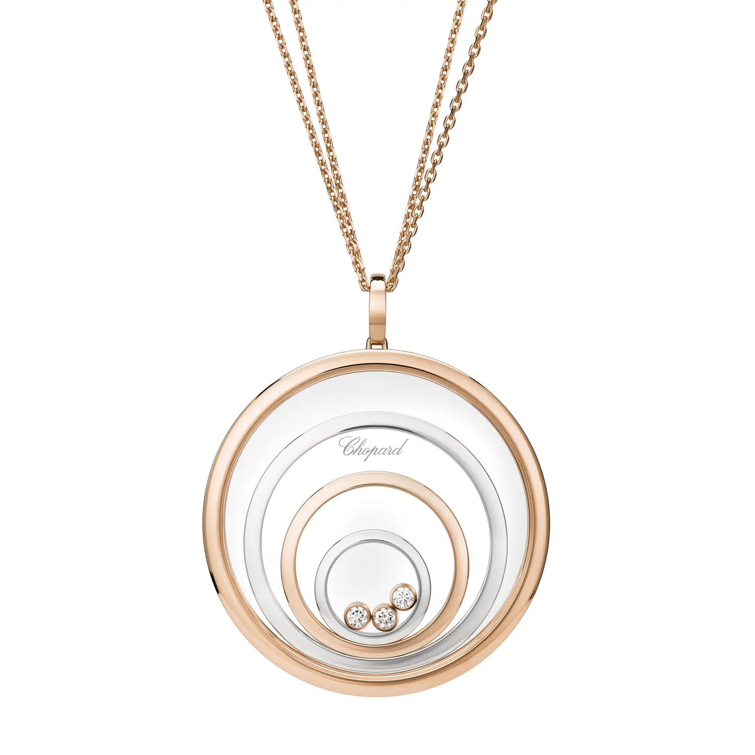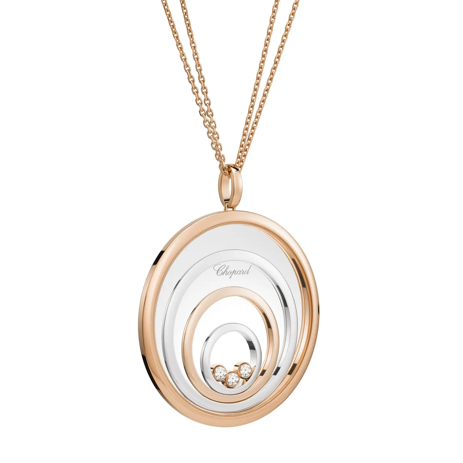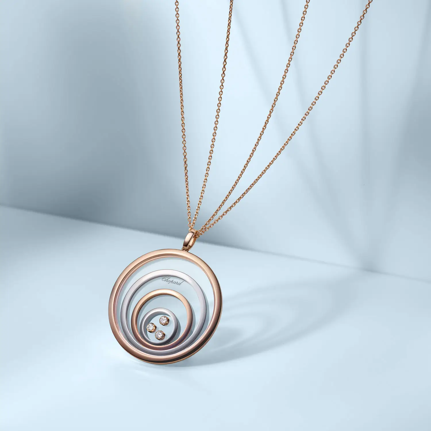 The Chopard Happy Spirit 798233-9001 pendant embodies harmony, femininity, and timeless elegance. Crafted from a blend of ethical 18-carat rose and white gold, its design features concentric circles symbolizing balance and serenity. At its center, a freely moving diamond dances between sapphire crystals, surrounded by stones totalling 0.28 ct — the signature “Happy Diamonds” effect bringing sparkle and joy to every movement.