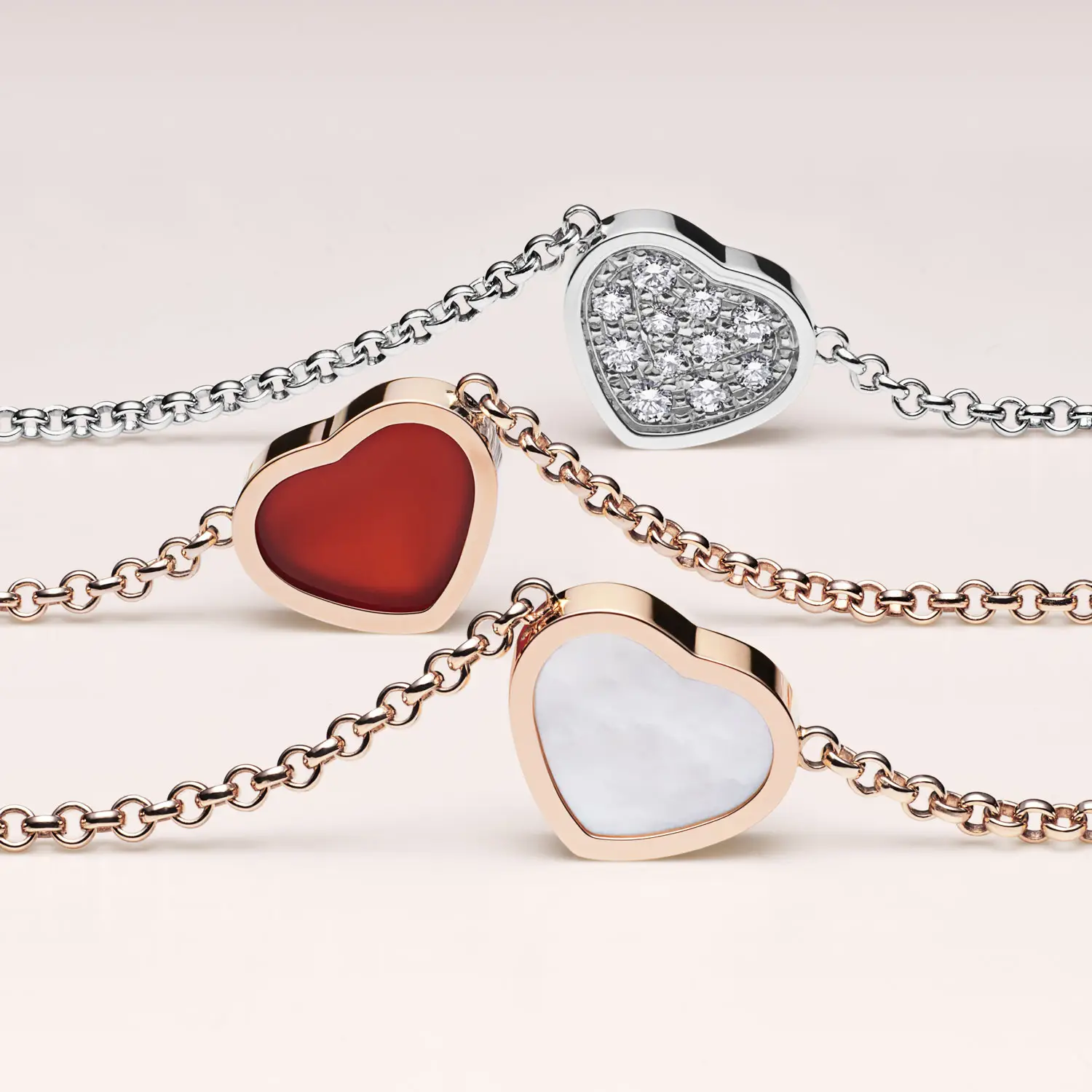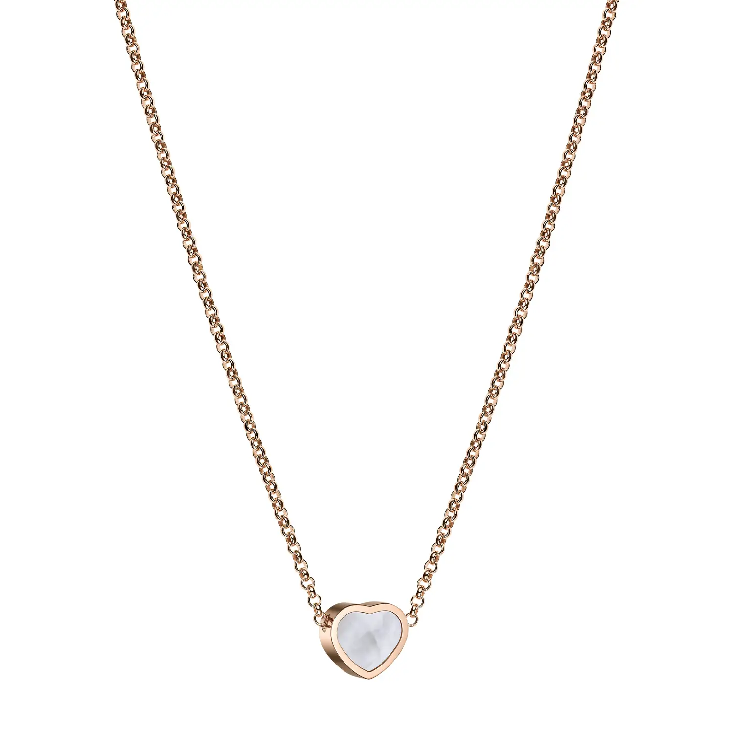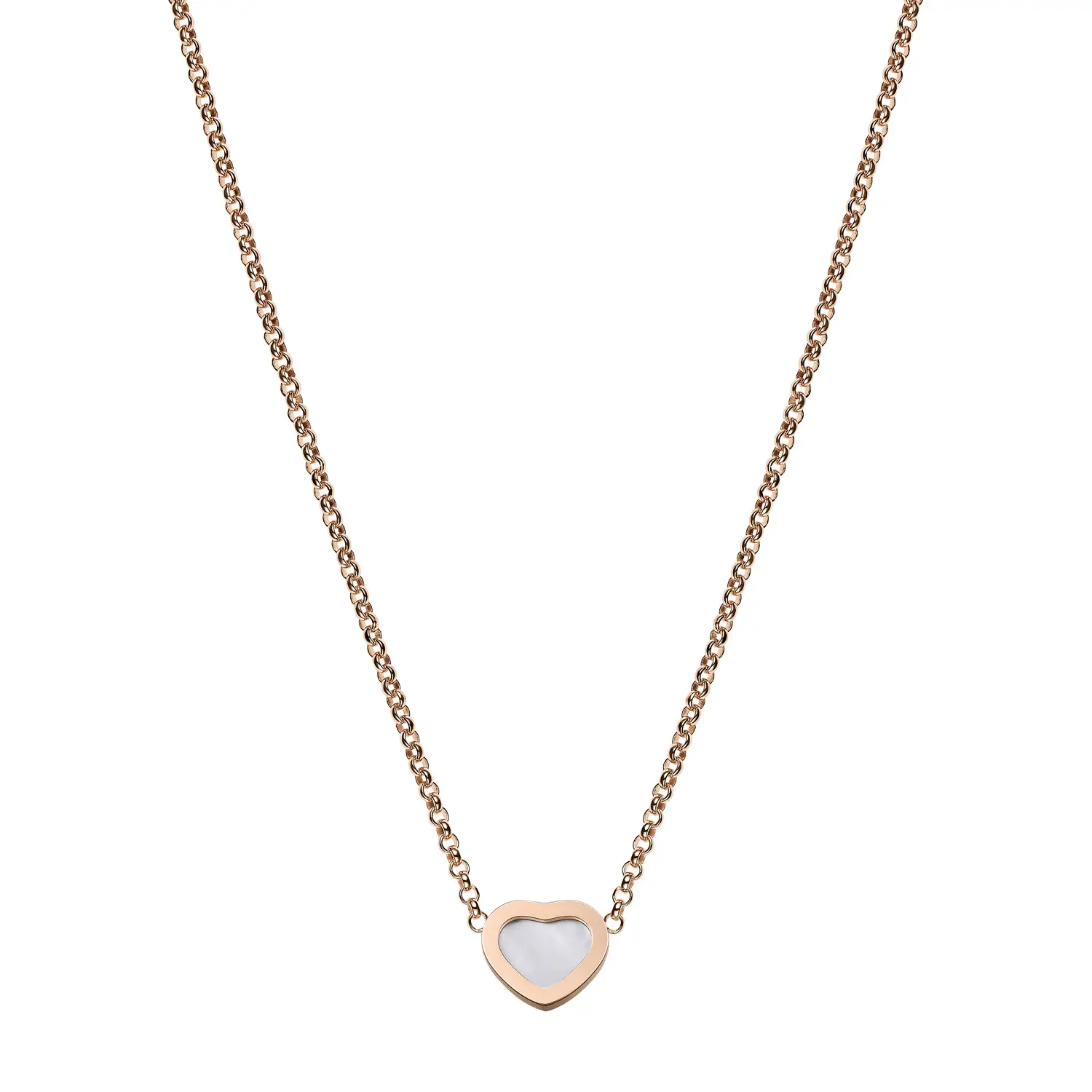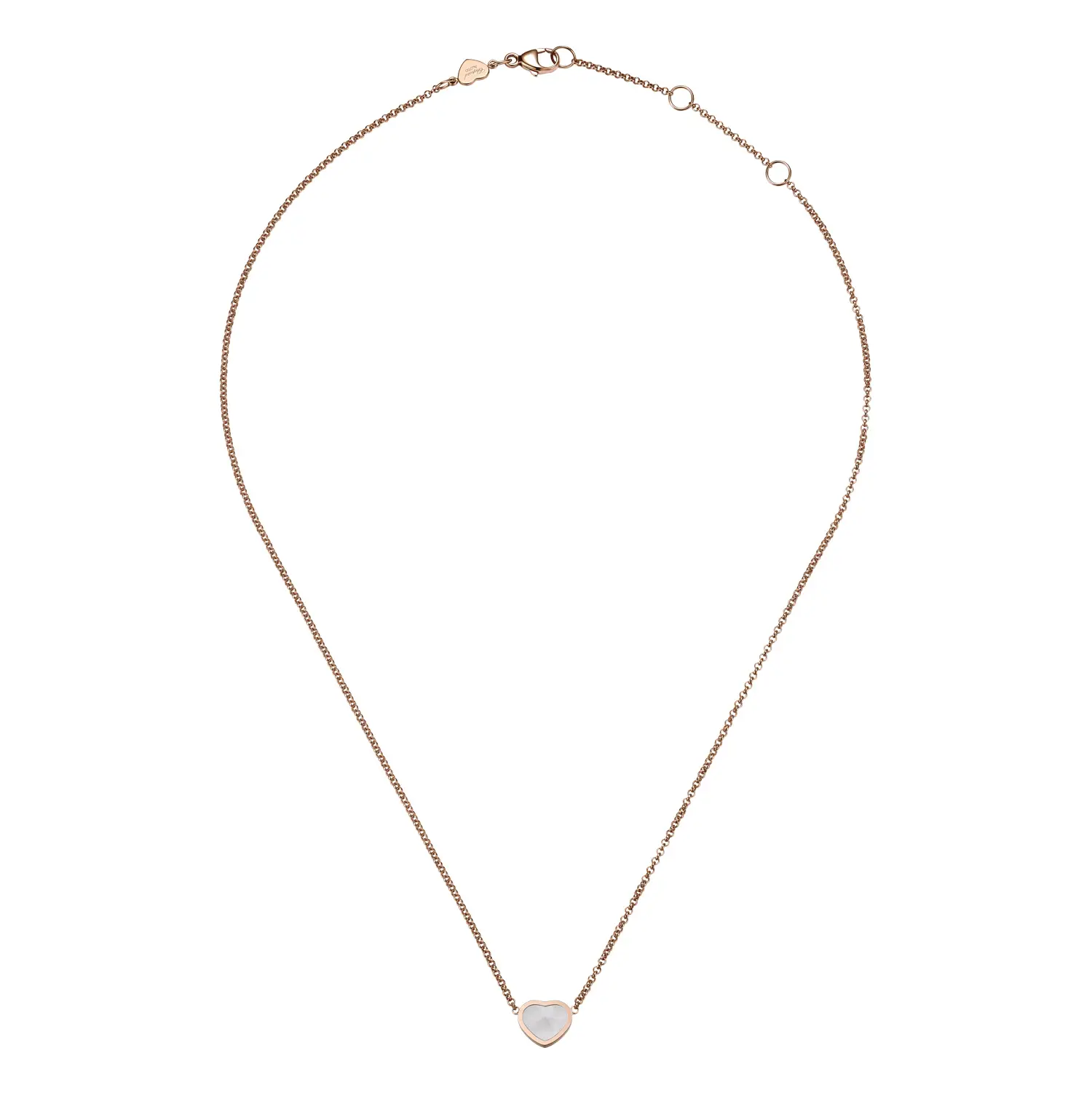 The Chopard My Happy Hearts 81A086-5301 necklace embodies delicate femininity and modern luxury. Crafted from ethical 18-carat rose gold, it features a white mother-of-pearl heart that shimmers beautifully in the light. The minimalist heart design symbolizes love, gentleness, and freedom.