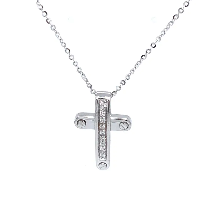The Zancan Insignia EC584B cross pendant embodies faith, strength, and masterful Italian craftsmanship. Made of 18 kt white gold (750/1000) with a highly polished finish, it captivates with its clean lines and refined brilliance that catches light with every motion.