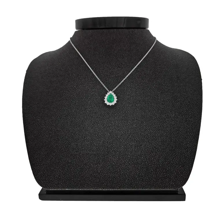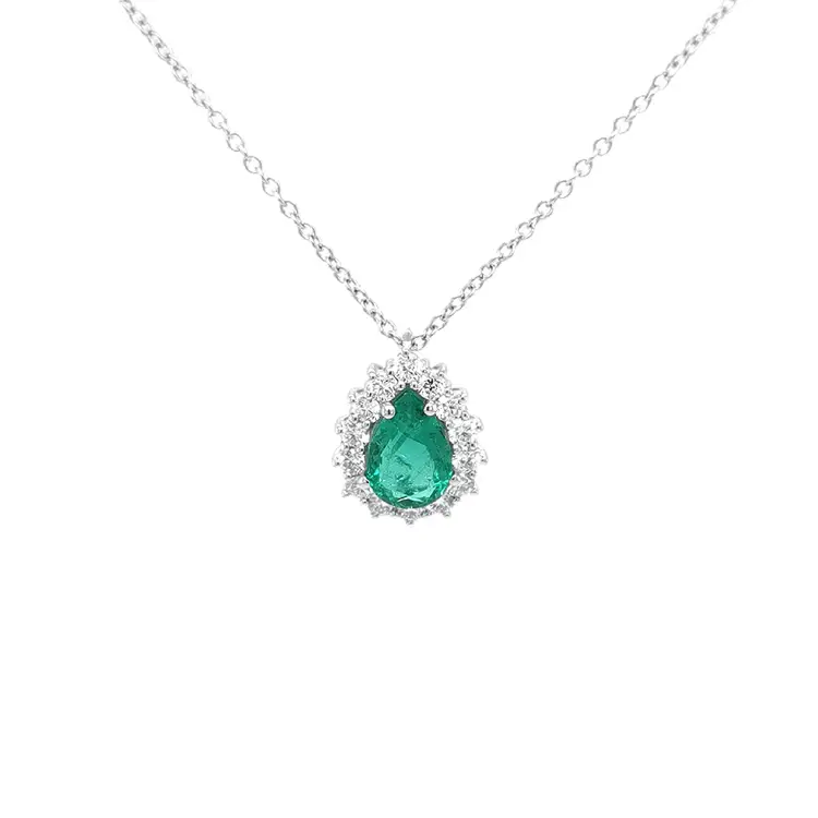 At its heart lies a stunning natural emerald in pear shape, weighing 1.38 ct and measuring 8.99 × 6.25 × 4.57 mm. The gemstone’s rich green hue conveys renewal, balance, and timeless beauty. Its vivid color glows against the crisp brilliance of white gold, creating a harmonious contrast that embodies both purity and sophistication.