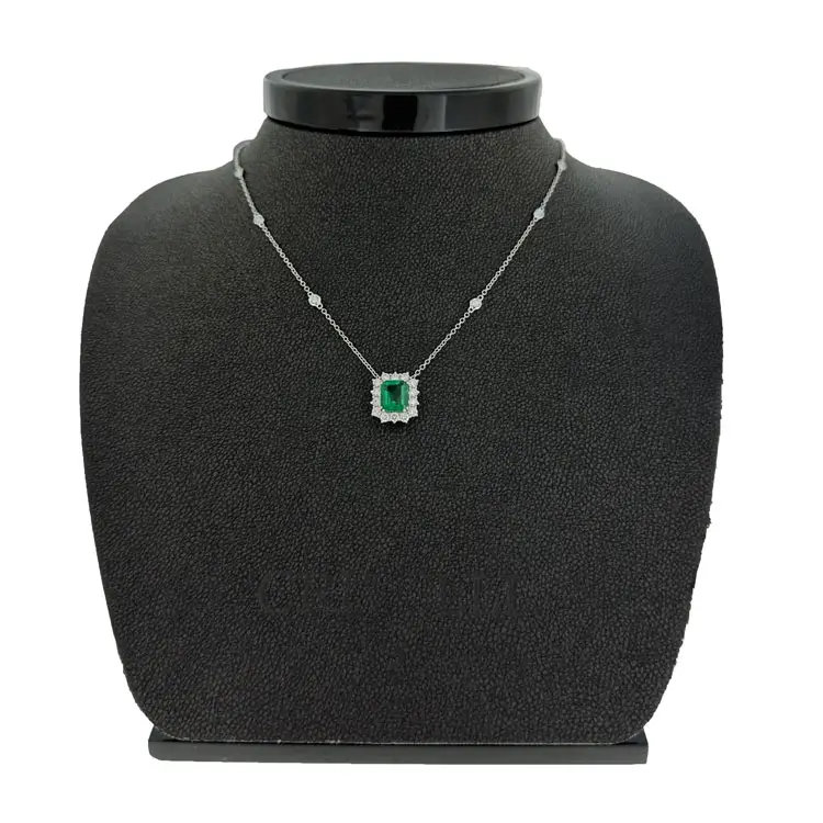 Crafted from 18kt (750/1000) white gold, this pendant combines refinement and durability with its sleek, lustrous finish. The central natural emerald weighing 1.46 ct, cut in an elegant emerald shape, is complemented by diamonds totaling 0.64 + 0.16 ct of G/VS quality. With an overall weight of 4.3 g, it conveys both delicacy and presence, embodying the grace of fine jewellery.