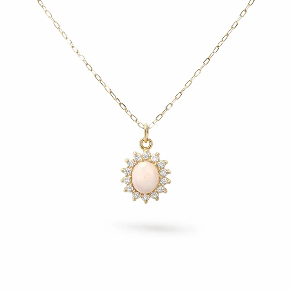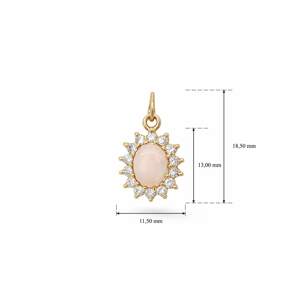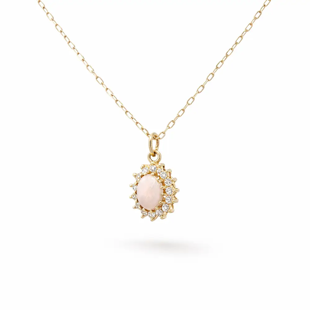 The gold pendant with opal and cubic zirconia has a delicate and elegant appearance thanks to the harmonious combination of a smooth oval opal and sparkling zirconia set around it. Precisely crafted gold highlights the natural beauty of the central stone and gives the piece a timeless look that is subtle yet eye-catching.