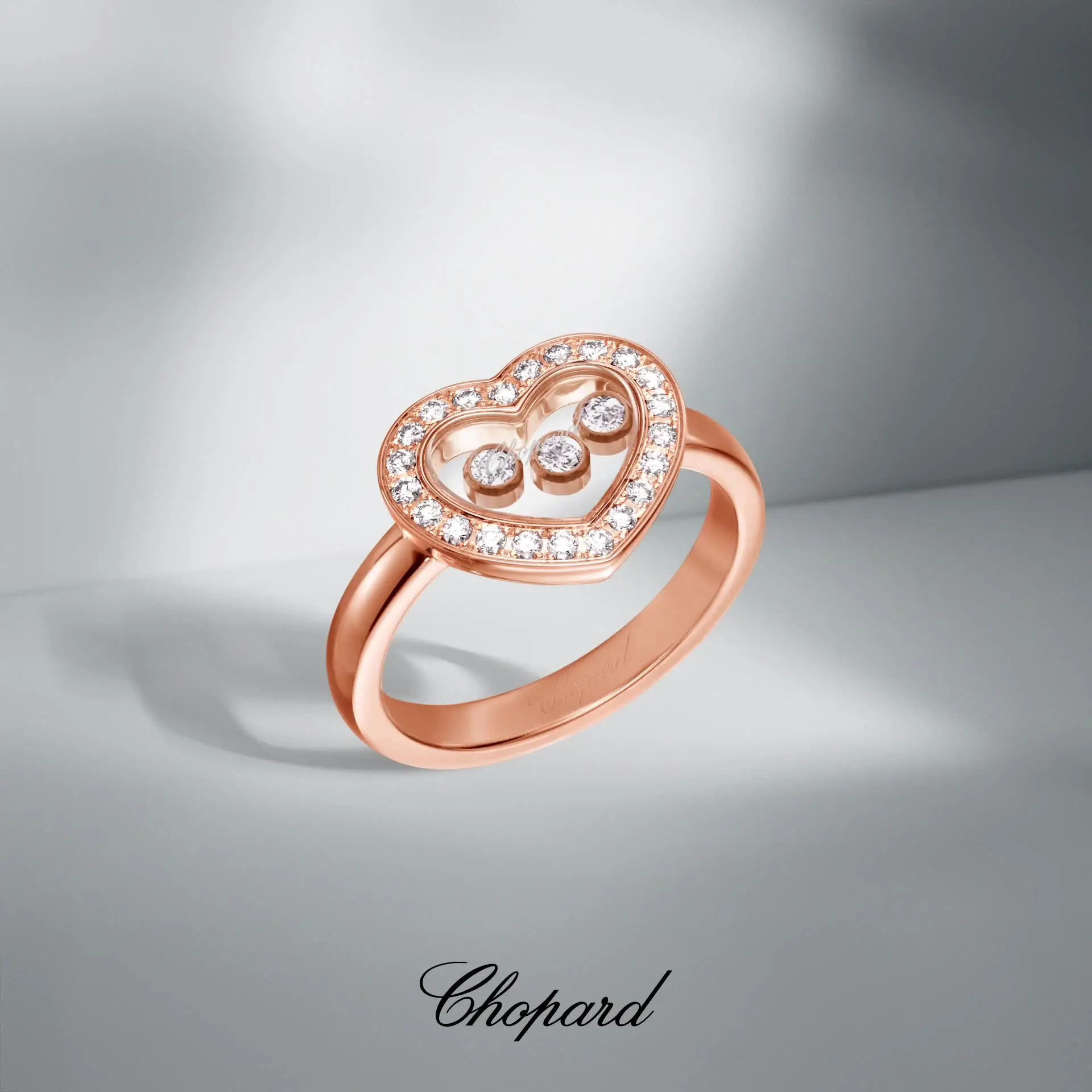 The Chopard Happy Diamonds Icons Ring 82A611-5211 in 18 K rose gold embodies playful luxury and refined elegance. At its centre, three floating diamonds glide freely between two sapphire crystals, shimmering beautifully with every movement. This iconic Happy Diamonds design symbolises freedom, light, and feminine grace, giving the ring its lively and distinctive personality.