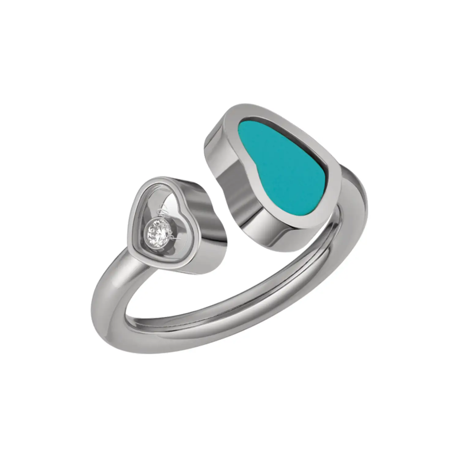 The Chopard Happy Hearts 829482-1408 ring blends joyful design with modern sophistication. Crafted from 18k white gold, it features a turquoise heart alongside Chopard’s signature dancing diamond, freely moving between two sapphire crystals and weighing approximately 0.05 ct.