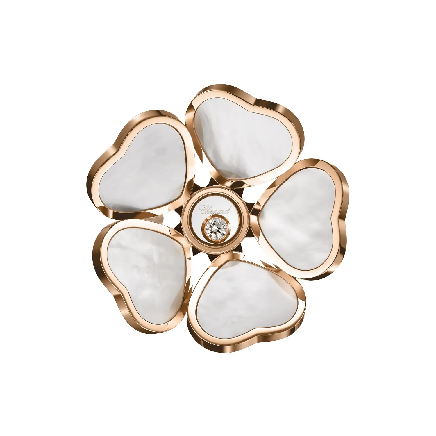 The Chopard Happy Hearts Flowers 82A085-5300 ring radiates feminine charm and playful sophistication. Crafted from ethical 18-carat rose gold, it features a white mother-of-pearl heart and a freely moving 0.05 ct diamond that catches the light beautifully. The flower-shaped motif made of hearts symbolizes love, joy, and natural grace.
