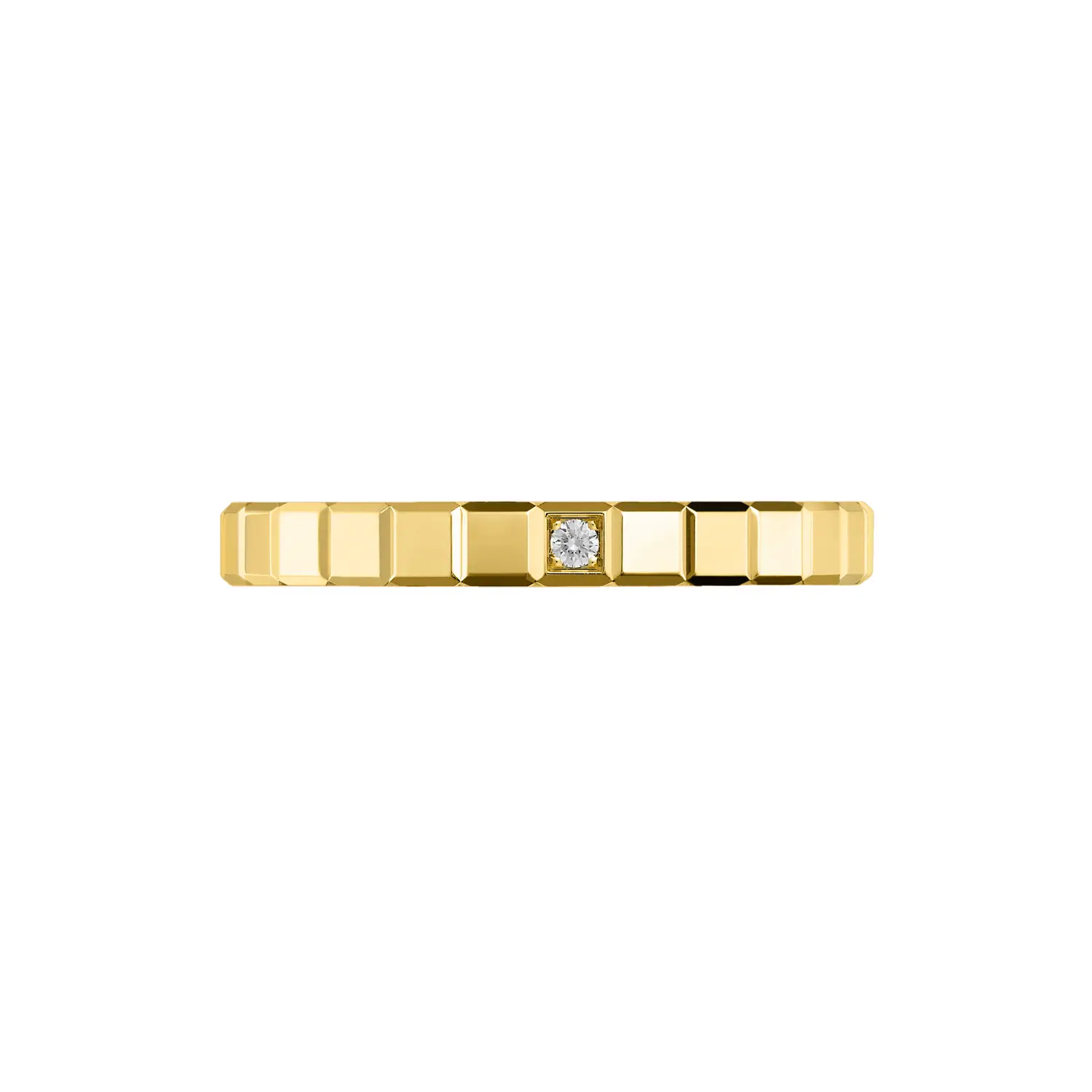 The Chopard Ice Cube Pure ring in 18k ethical yellow gold embodies a modern vision of elegance in its purest form. Its iconic cube-inspired design reflects light with every movement, creating a subtle play of golden reflections. The minimalist silhouette is enhanced by delicate diamonds totaling approximately 0.01 ct, adding a refined sparkle without compromising its harmonious simplicity.