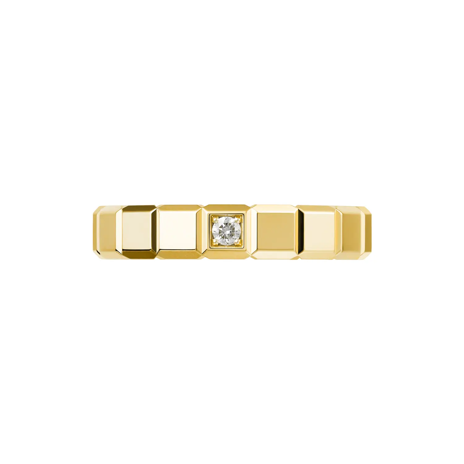 The Chopard Ice Cube Pure ring in 18k ethical yellow gold showcases modern elegance and refined craftsmanship. Its iconic cube-inspired design reflects light beautifully, creating a soft golden radiance reminiscent of glistening ice cubes. A delicate diamond of approximately 0.03 ct adds a subtle sparkle without disturbing the ring’s minimalist harmony.
