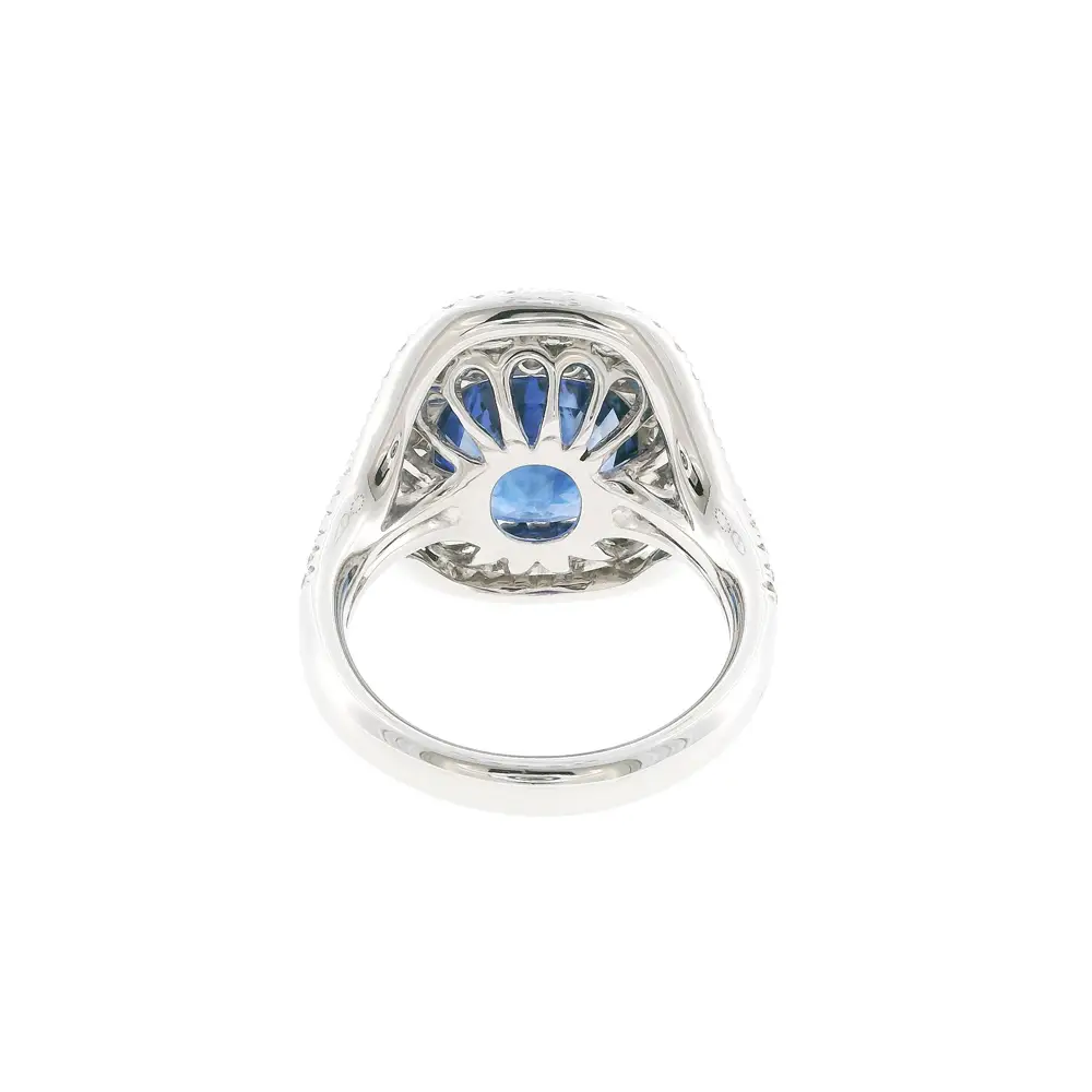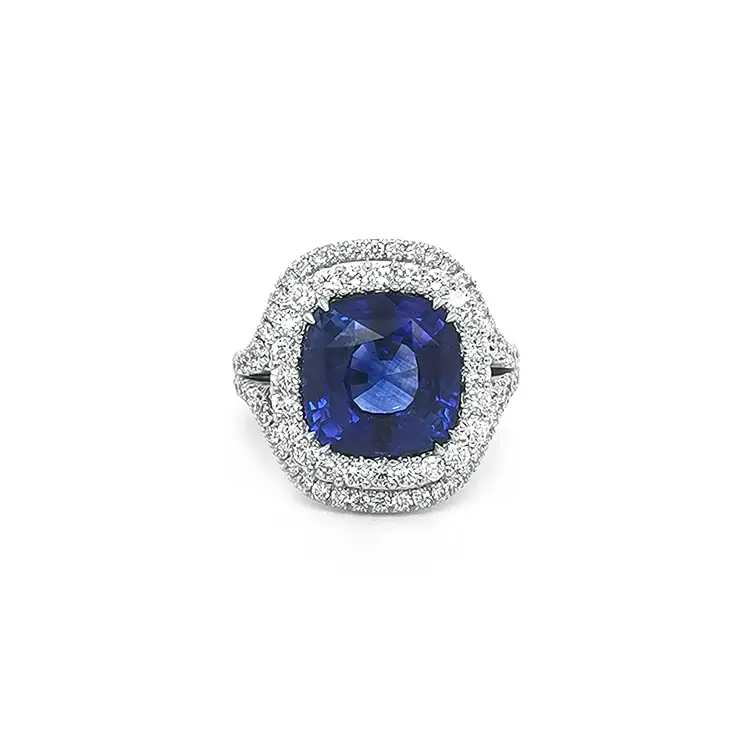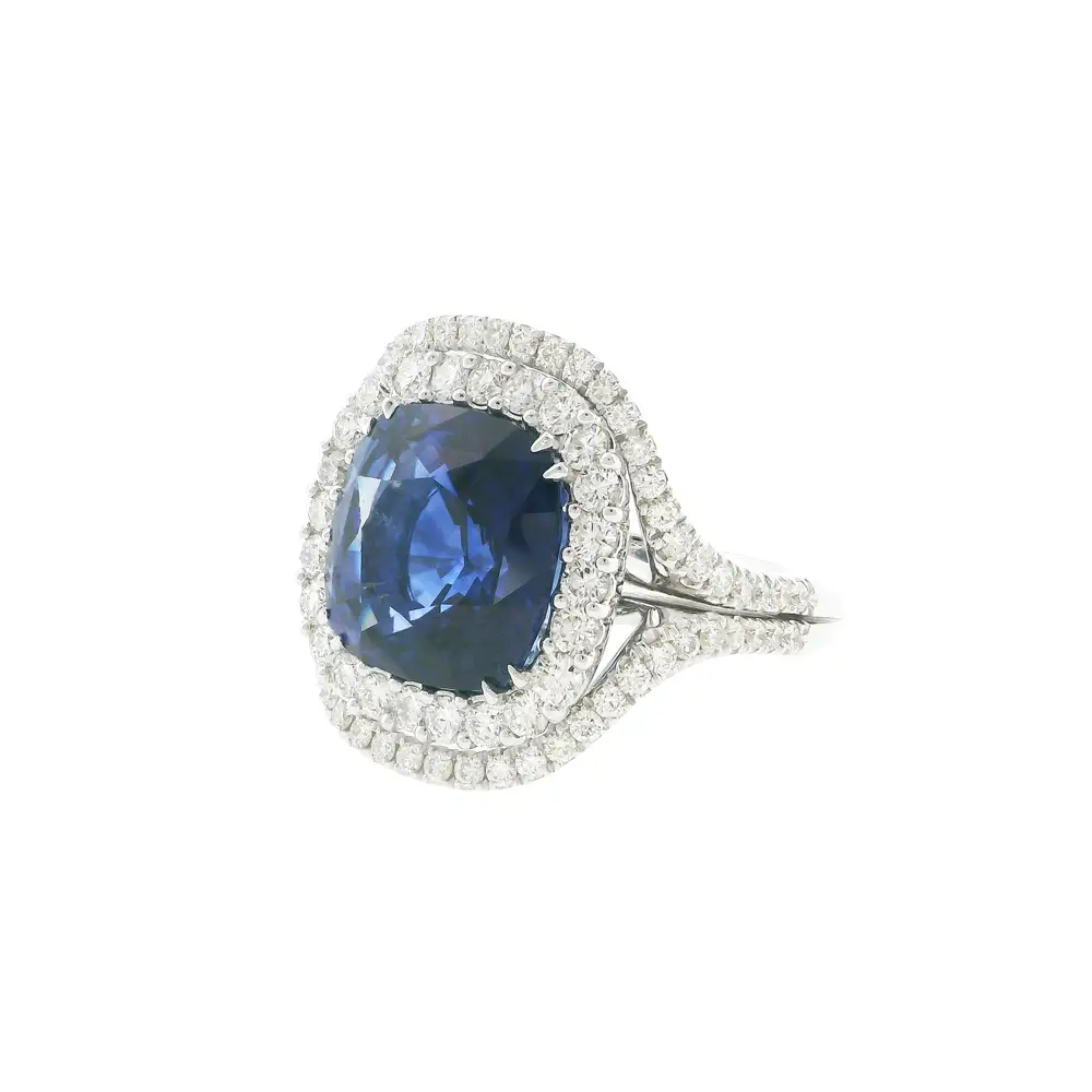 At the center is a natural sapphire, 7.67 ct (1 pc) in cushion cut (11.35 × 11.05 mm), deep blue. Sparkle and contrast come from pavé-set natural diamonds, 1.29 ct (88 pcs), round cut (1.70–2.30 mm), white, SI clarity, G color. The precise setting highlights both the sapphire’s depth and the diamonds’ brilliance—yielding a luxurious, striking, and timeless ring destined to be the centerpiece of your jewelry collection.